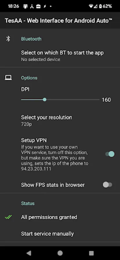 Da der Browser von Tesla Motors™ die Verwendung von RFC 1918 Netzwerkadressen verbietet, wird der VpnService verwendet, um dem Telefon eine echte öffentliche IP zuzuweisen. Kein Datenverkehr wird über das VPN umgeleitet, der VpnService dient ausschließlich zur IP-Zuweisung.