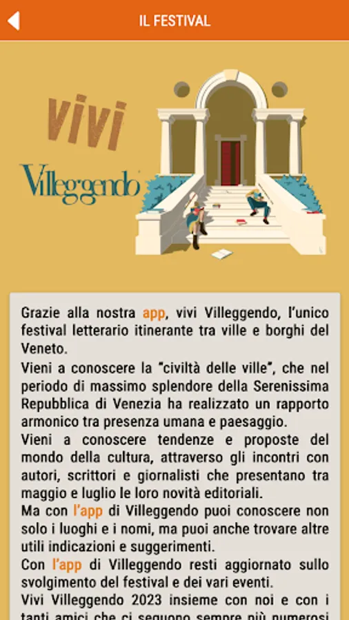 All the information of the 2023 edition of Villeggendo with the updated program of events, the authors, the places and all the information necessary to be able to attend the festival.