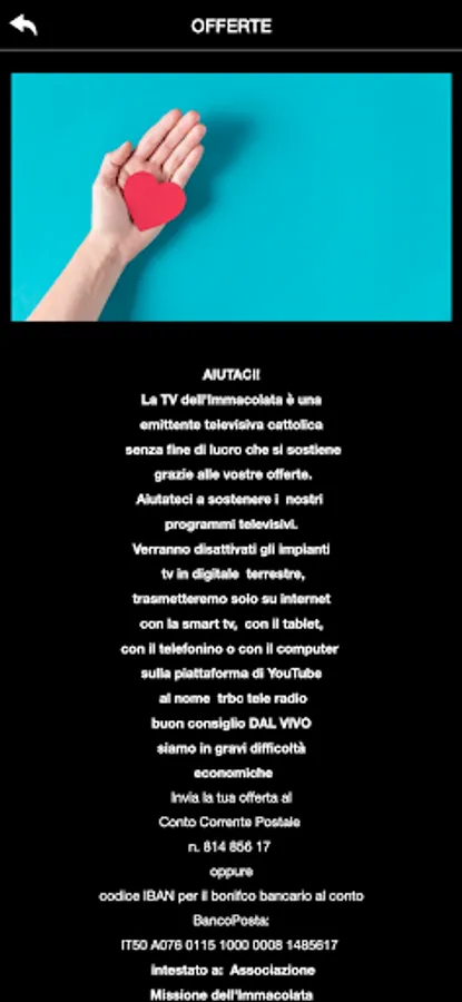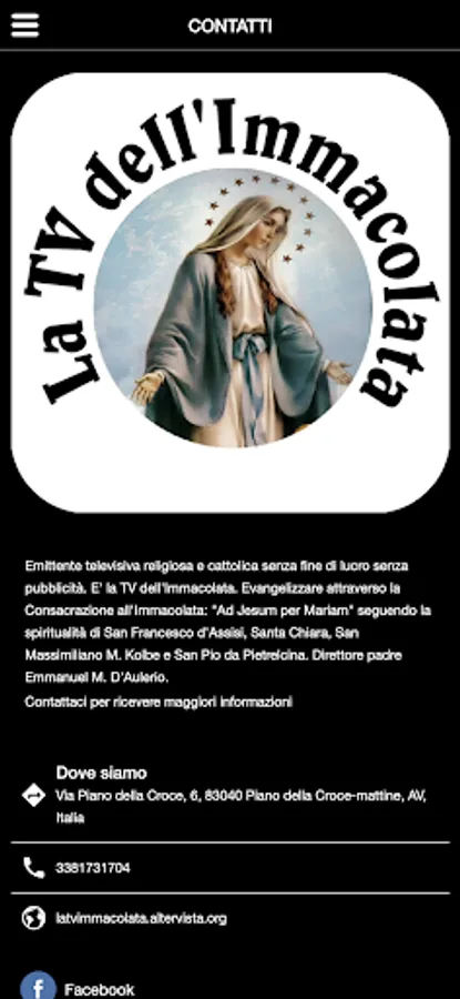 Ours is a broadcaster that broadcasts the Holy Mass, the Holy Rosary and the Eucharistic Blessing live on television every day from our Marian shrine (Italy).
