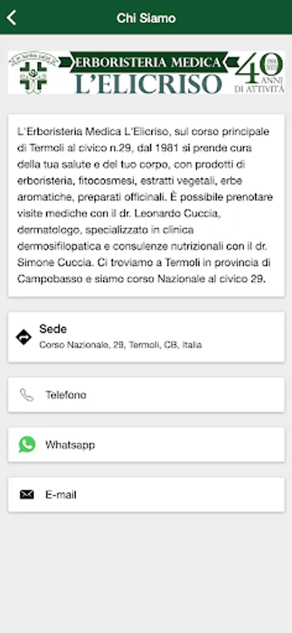 With the L'Elicriso di Termoli Medical Herbalist APP you can take care of your health and your body, with herbal products, phytocosmetics, plant extracts, aromatic herbs, and officinal preparations. You can book medical visits with dr. Leonardo Cuccia, dermatologist, specialized in dermosyphilopathic clinic and nutritional consultancy with dr. Simone Cuccia, nutritionist biologist.