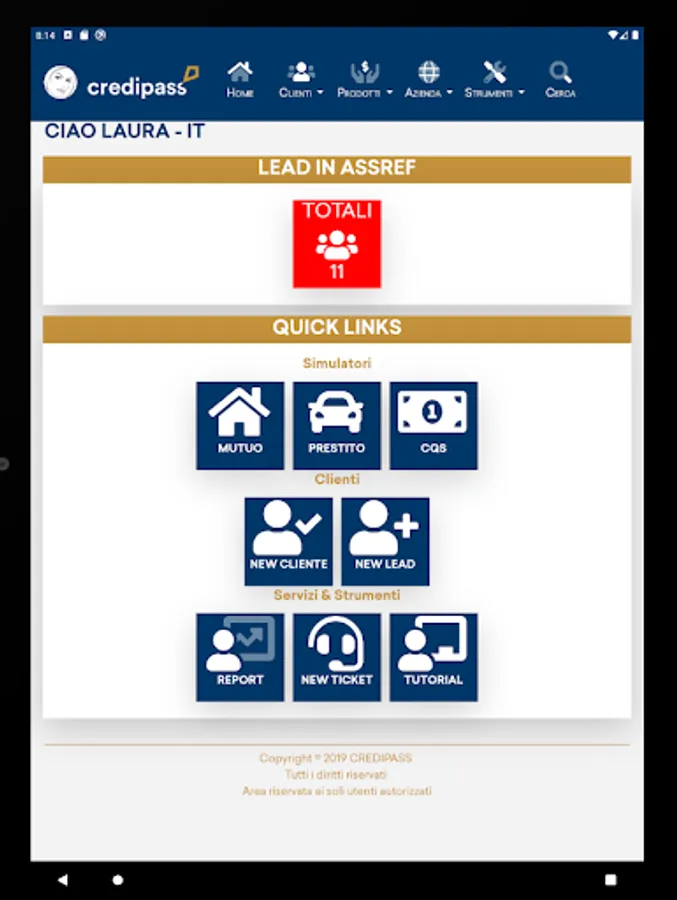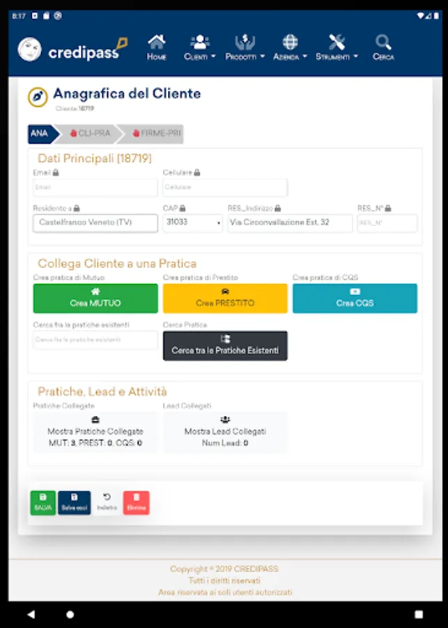 Credipass CRM: it is possible to manage the activities on the potential customers acquired and then proceed with the acquisition of the customer according to the legislation in force through FEA (Advanced Electronic Signature).