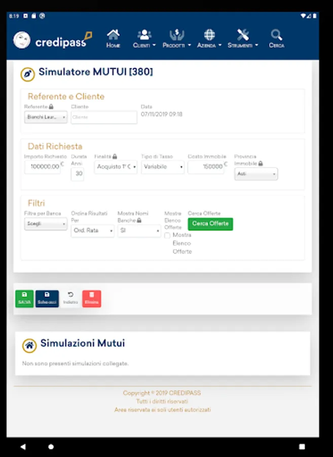 Offers Simulations: it is possible to generate simulations for the Credipass Mutuo, Prestiti and CQS products and to be able to save them within your own work area.