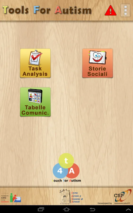 This app is part of the t4A (touch4Autism) project and is the result of a successful collaboration between the Foundation ASPHI Onlus, C.A.S.A. - Centro Autismo e Sindrome di Asperger of the A.S.L. Cuneo 1 and CSP Innovation in ICT, with the support of CRC Foundation, CRT Foundation and La Stampa (Specchio dei Tempi).