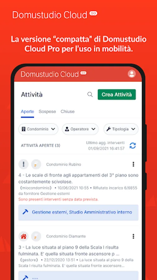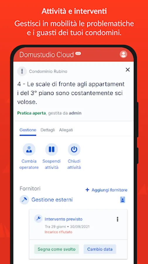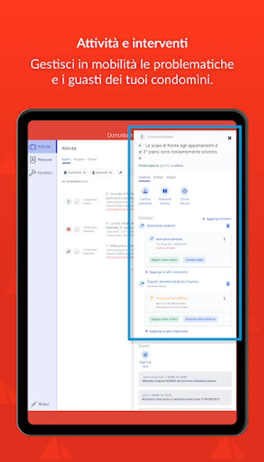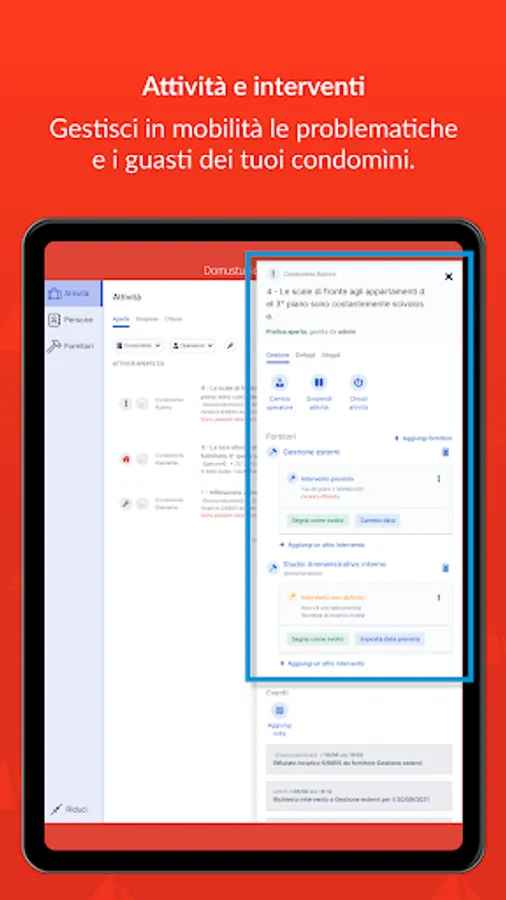 Manage activities and interventions on the move and in real time with the problems and breakdowns of your condominiums always under control. In a coordinated way with your collaborators and your suppliers.