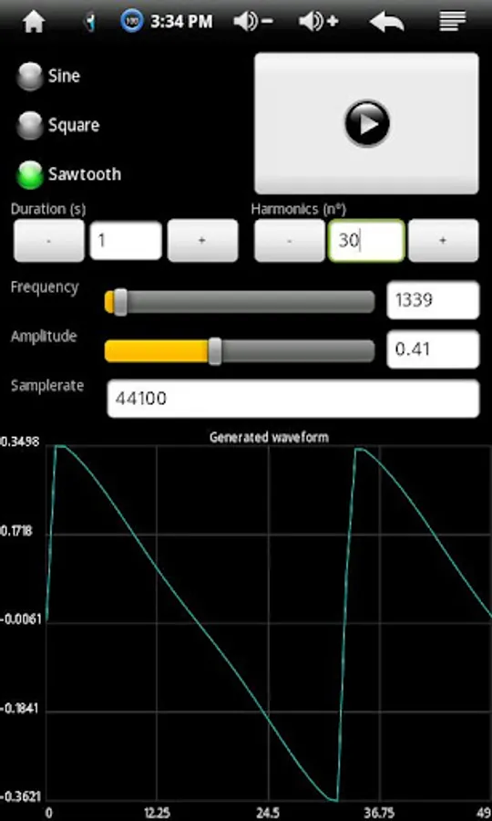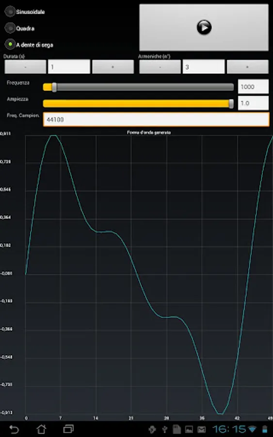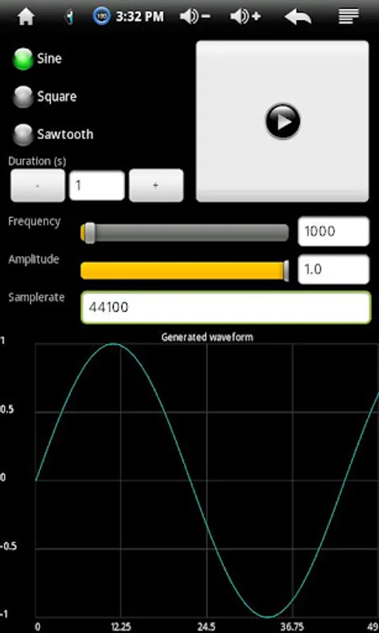 CAUTION: playing very loud square or sawtooth signals can damage the device's speackers.