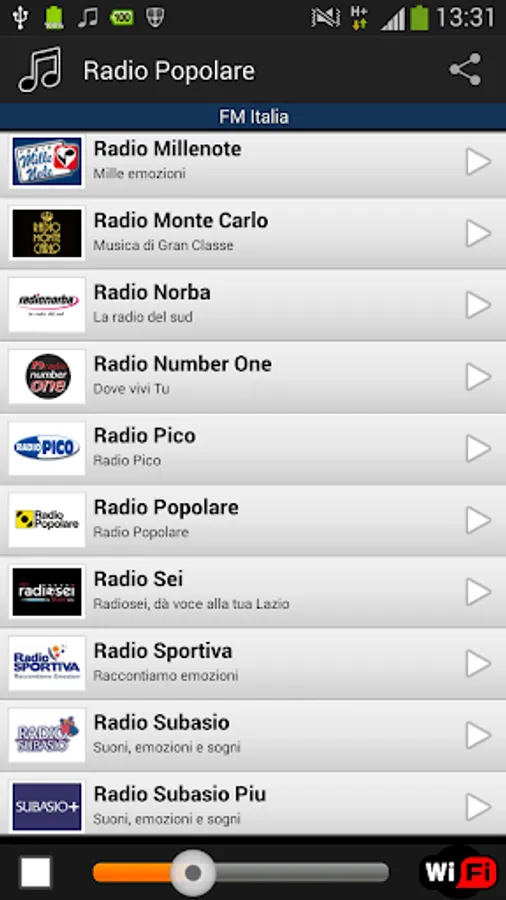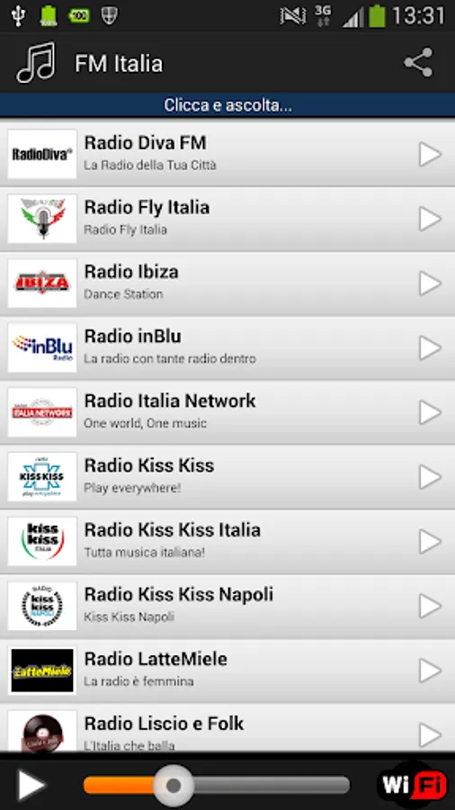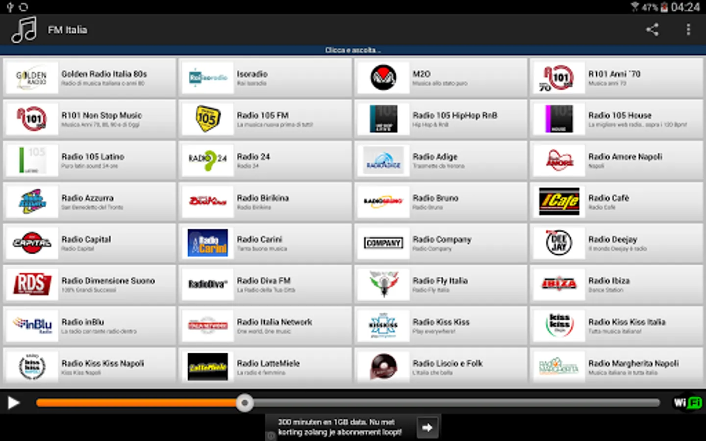 Include listening to: RAI Radio Uno, Radio Deejay, R101 Non Stop Music, Radio Capital, M2O, RTL 102.5, Radio Subasio, RAI Radio Due, Radio 24, Venice Classic Radio, Radio Cafè, Radio Company, Viva FM, Radio Heart, Virgin Radio Italy, Radio Norba, RMC 2, Radio Popolare, Radio Adige, Radio Pico, Radio Six, Radio Radicale, Radio 105 FM, Radio 105 INDAKLUBB, Radio 105 Dance 90, Radio Monte Carlo, Radio LatteMiele, Radio 105 HipHop RnB, Radio Kiss Kiss Italy, Radio Liscio and Folk, Radio Subasio Piu, Radio Suby Nice, Radio Margherita Naples, Radio Touring, RAI Radio Tre, Radio Millenote, Radio Number One, Radio Studio Piu, Radio Love, Radio Diva FM, Radio Italia Network, Radio Dimensione Suono, Radio Bruno, Radio Maria, Isoradio, Radio Kiss Kiss, Radio Fly Italia, TRS Radio, Radio Ibiza, Radio in Blue, Radio Sport, Radio Kiss Kiss Naples, Radio Marte, Radio Azzurra, Radio Birikina, Radio Rosa, Radio Touring 104, RMC Love Songs, Radioradio, Radio Bari, Radio Puglia, Radio Selene, La Fen ice Channel, Discoradio, StereoCittà, Radio Bella & Monella, Radio Piterpan, RMC Italia, RMC Monte Carlo Nights, RMC 80, RMC 90, Radio Gelosa, Radio Marilù, Radio Italia.