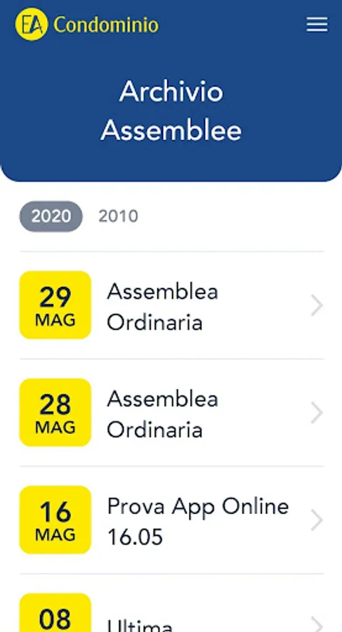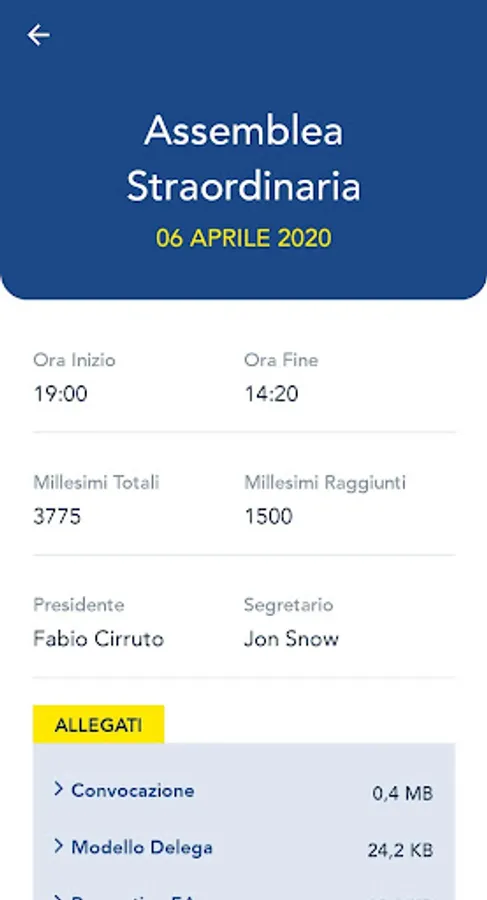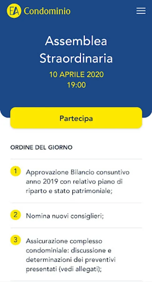 At the end of the meeting directly on your smartphone, with a simple click, you will have access to the archive of all the meetings held in the condominium cataloged by date, with all the decisions taken, the list of participants, the votes and all the archived documents, (such as minutes, any approved quotes, connection log and much more).