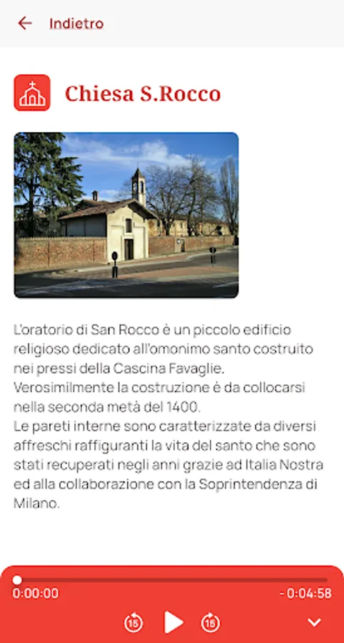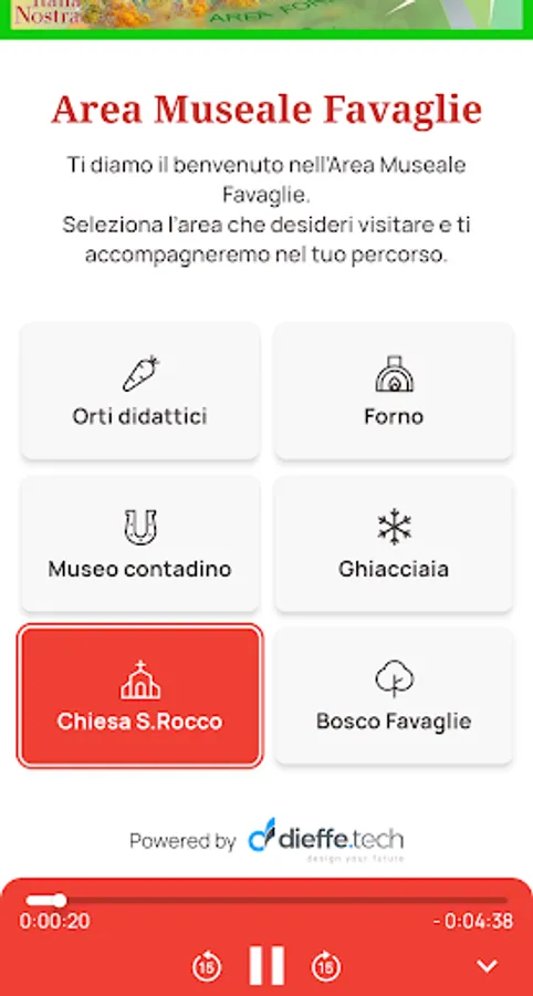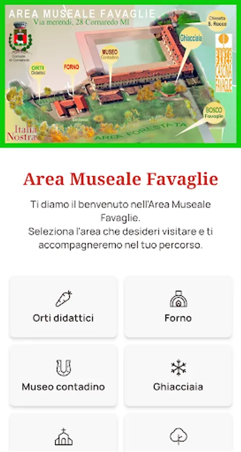 The App allows access to short audio clips (about 5 minutes) created to allow visually impaired or blind people to visit a museum site managed by the Italia Nostra Nord Ovest Milano association independently or with limited assistance. Beacons are used, installed in the most characteristic points of Cascina Favaglie San Rocco in Cornaredo where Italia Nostra has created and manages a peasant museum, a restored church, an ice house and other interesting environments. The App was created with the fundamental contribution of Dieffe.Tech
