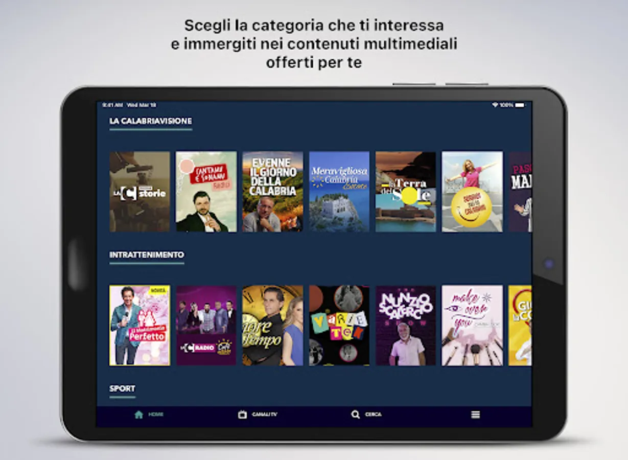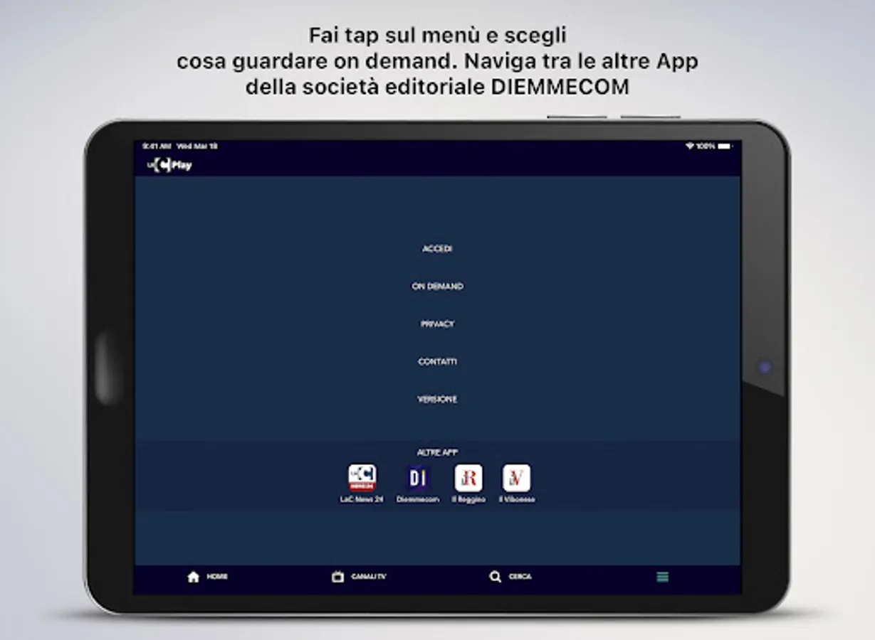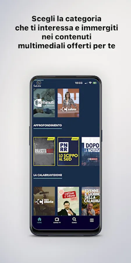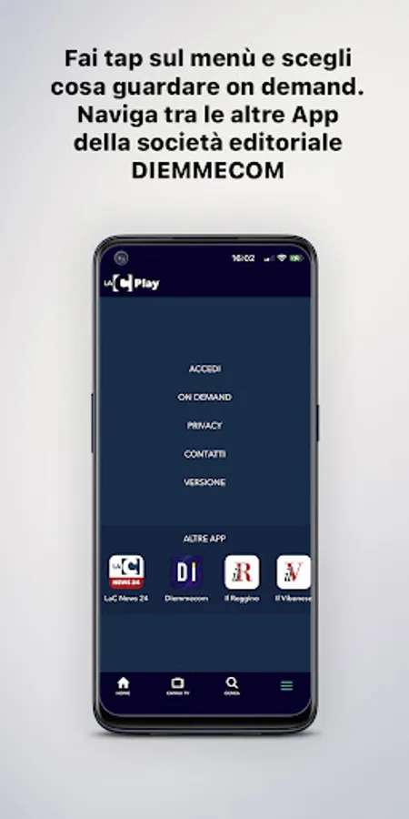By tapping on the menu at the bottom right you can select the categories and access the program you are interested in, browse the other apps of the Diemmecom Publishing Company, register or log in directly through your social account to save your favorite episodes.