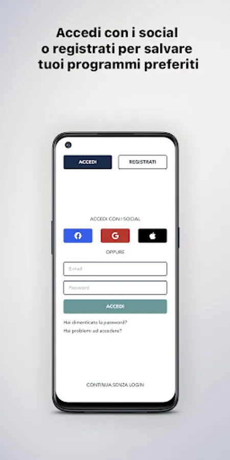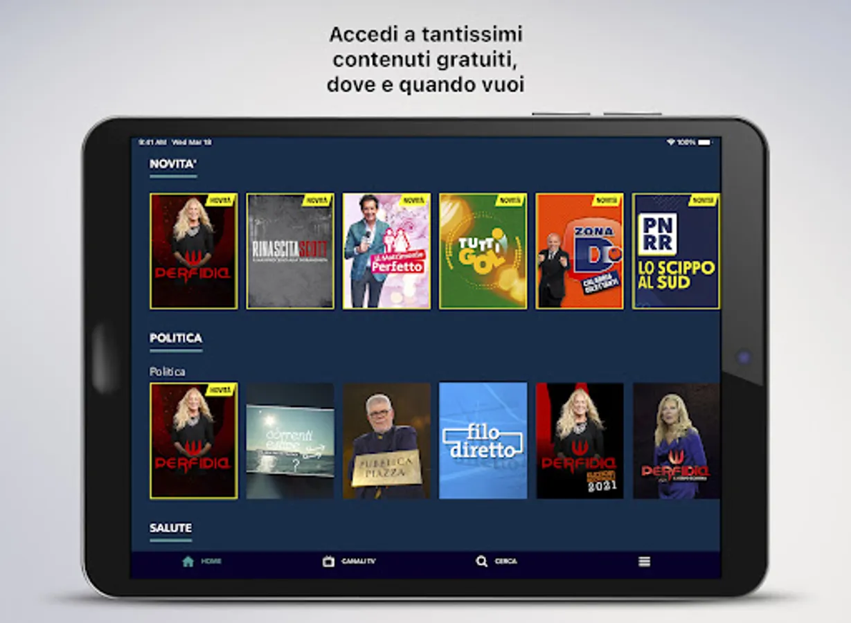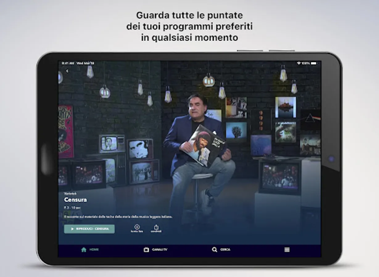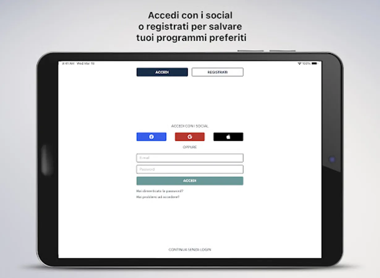 By tapping on the menu at the bottom right you can select the categories and access the program you are interested in, browse the other apps of the Diemmecom Publishing Company, register or log in directly through your social account to save your favorite episodes.