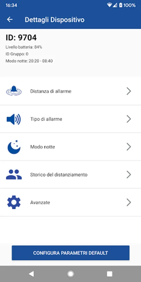The app allows you to configure various parameters of the 4D-Watch device, including the contact detection distance, the warning mode (Led / Buzzer / Vibration), the warning delay and contact recording.