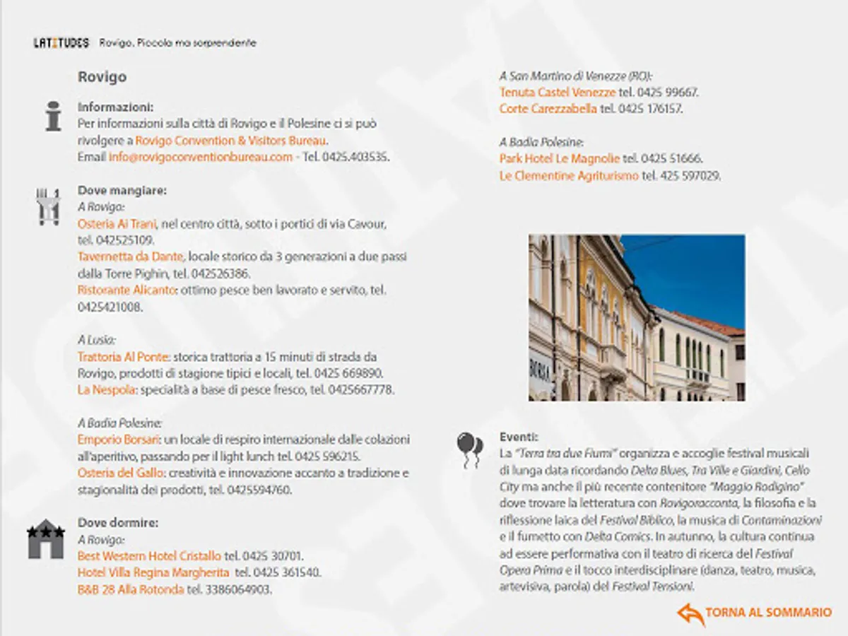 Discover Rovigo is the completely free APP in Italian that allows you to download the Latitudes guides of the city of Rovigo, a small but surprising city and its province.