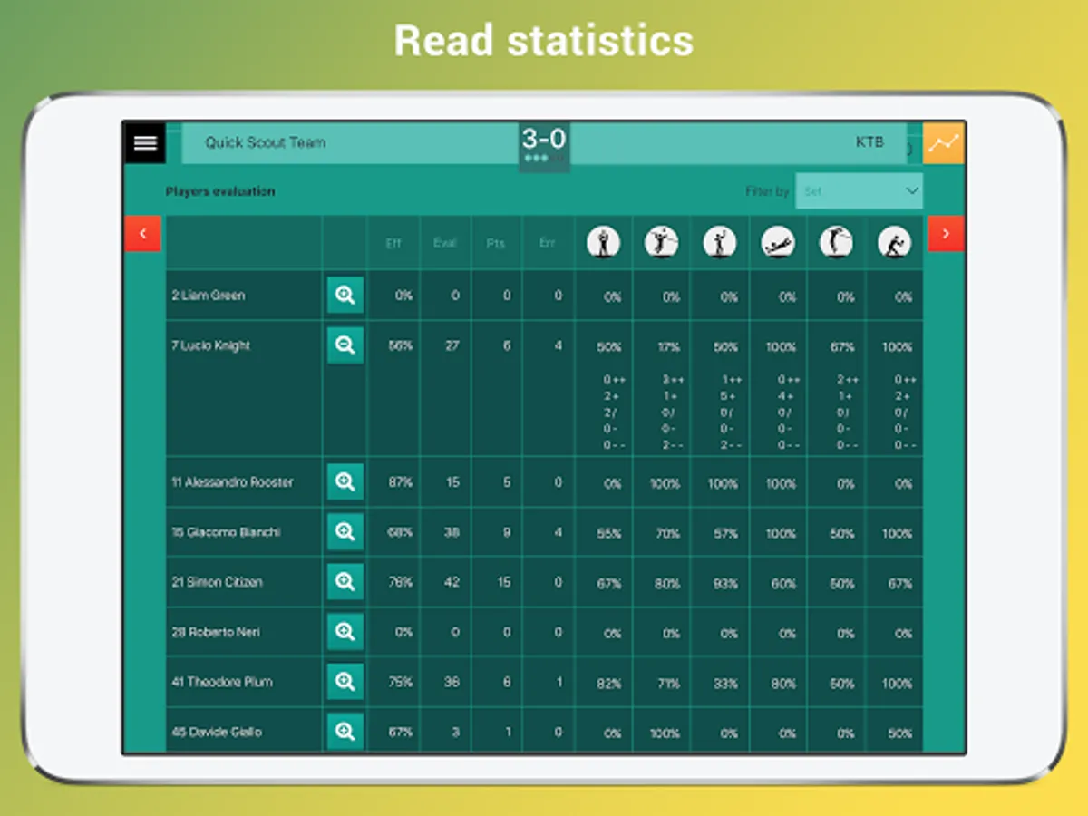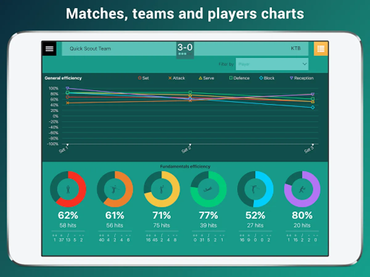 The data acquisition system and the statistics generation system complete the app and makes it a valuable professional tool. Match charts and reports will be an indispensable tool for the game observer. Quick Scout Volley also allows the analysis of attack efficiency according to the setter and the current rotation.