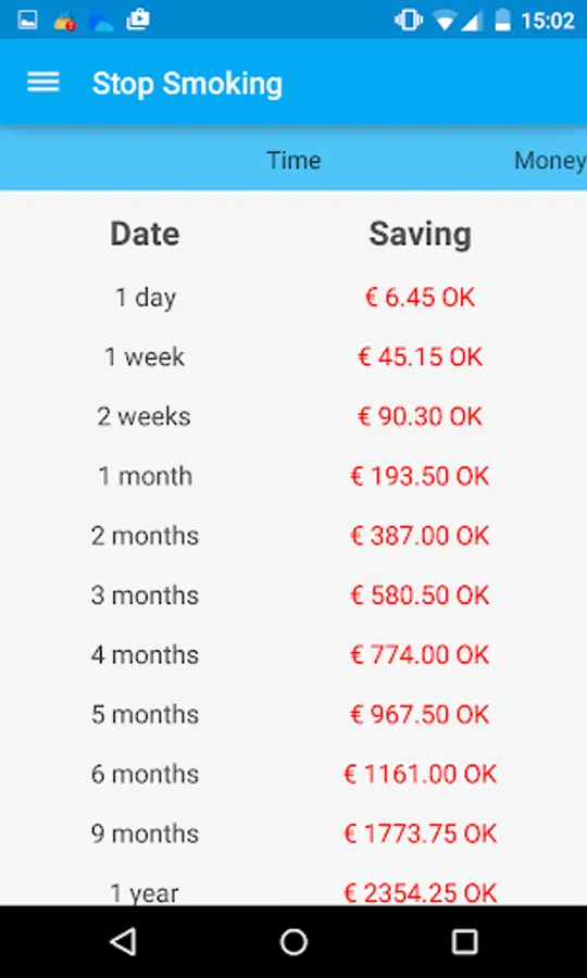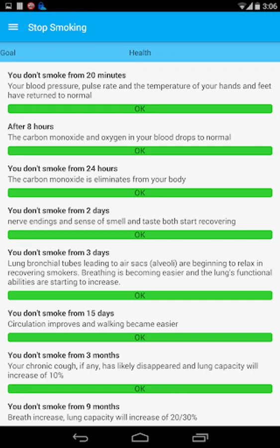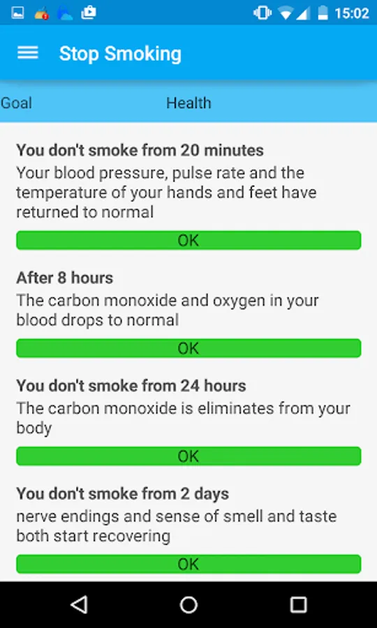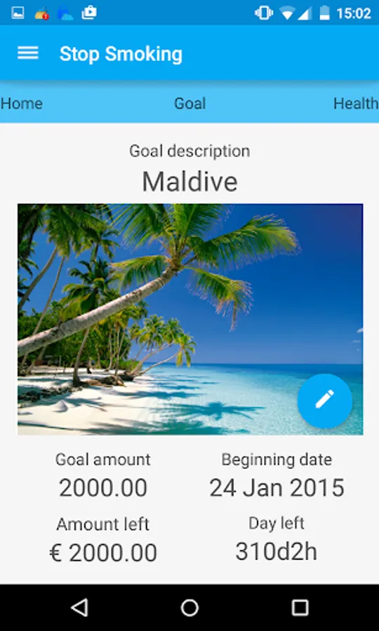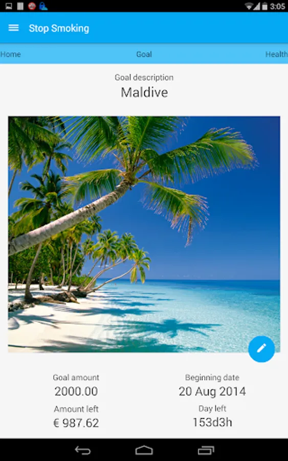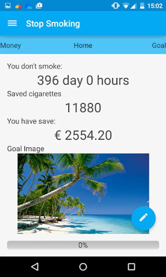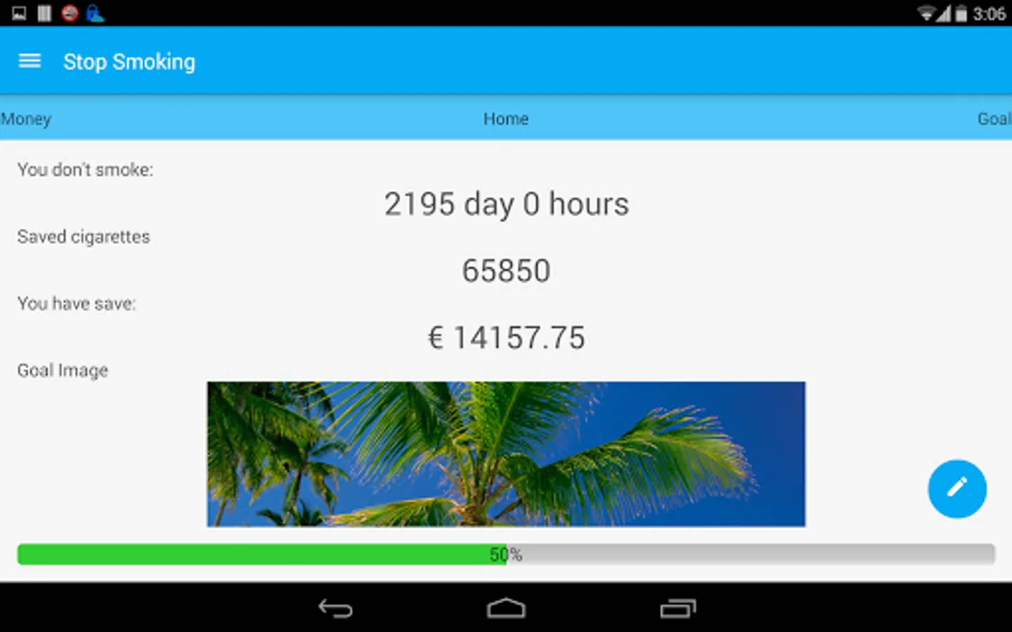 When you stop to smoke cigarettes you need small satisfaction that support your motivation in quite smoking. Stop Smoking permit to you to set your personal goal, see it taking a picture from the camera or from your gallery. You can see how many day you need to reach it, and you will receive a notification when you reach it.