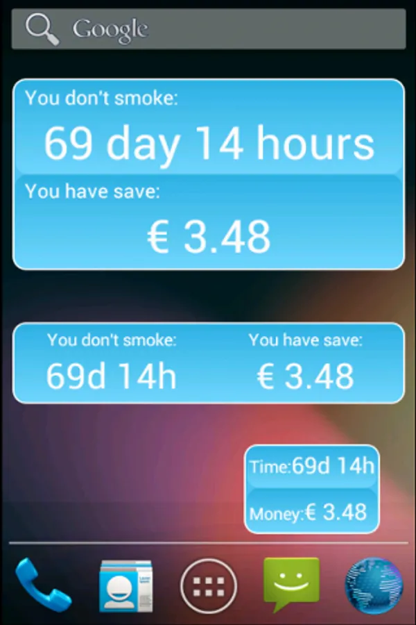 You can set one of the 3 widget (small, medium, large) in your home page and see how much money you see and how many days have spent since the last cigarette.
