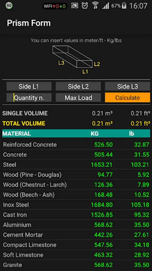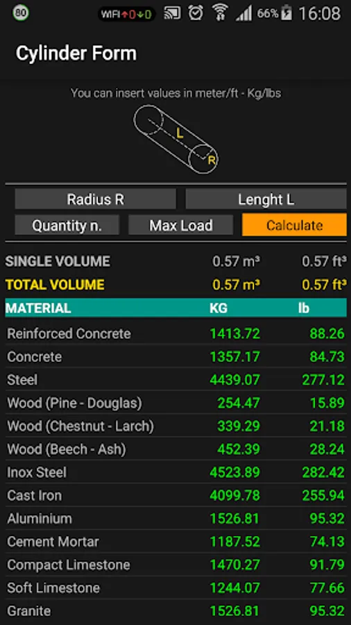 the app will give you the volume of the single beam, the total volume, and the total load. If you put the volume quantity = 1, and the load is a single beam or floor etc.