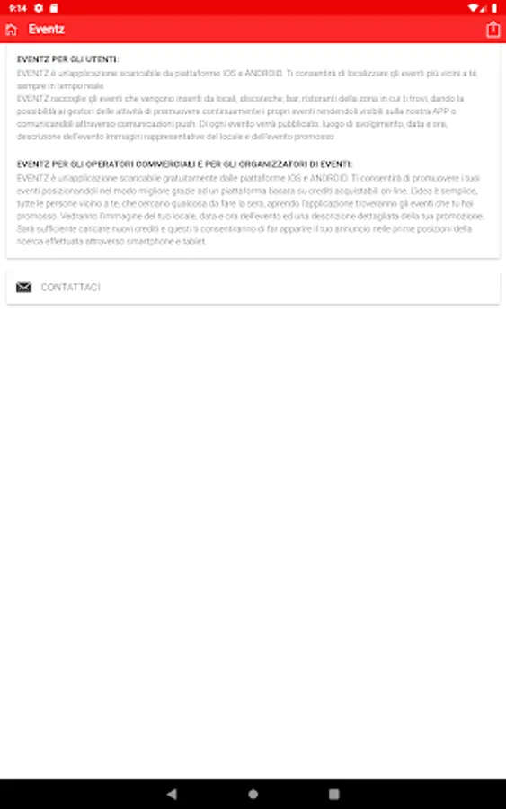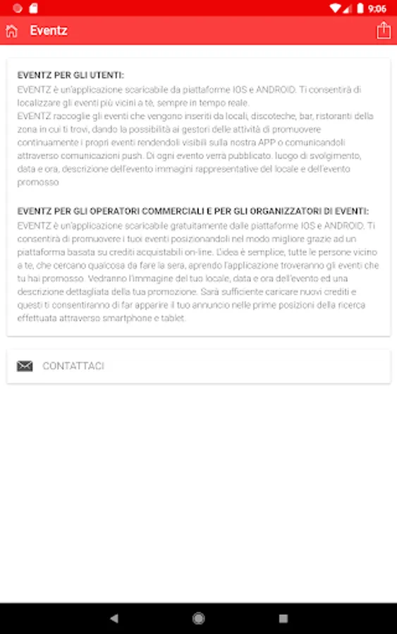 EVENTZ is an application that allows you to locate the events closest to tea and always in real time. EVENTZ collects the events that are loaded from clubs, discos, bars, restaurants, in the area where you are, giving the possibility to the activity managers to continually promote their events making them visible on our APP or communicating them through push communications. Each event will be published. venue, date and time, description of the event images representative of the venue and the event promoted