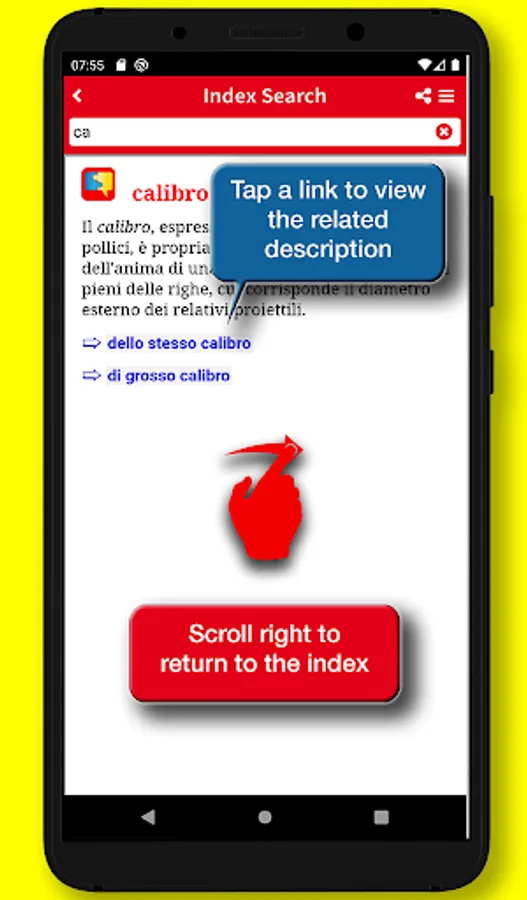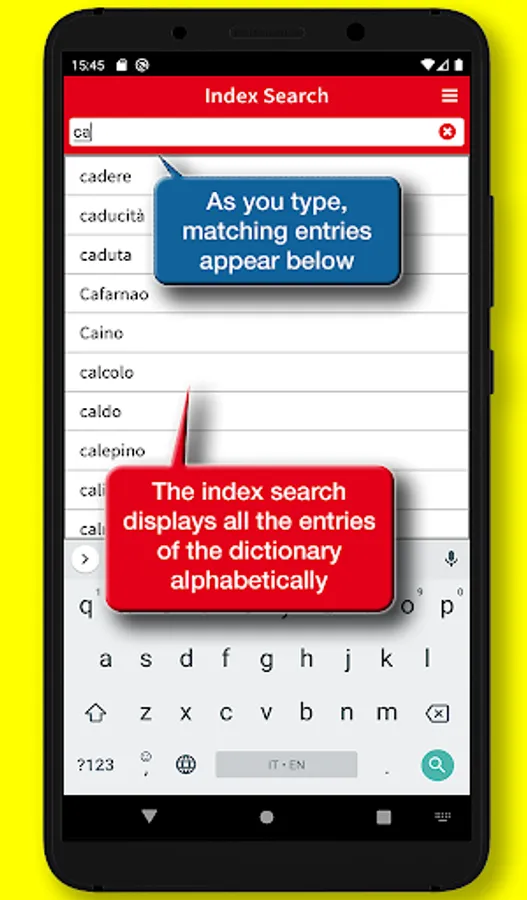 • Index search: displays in alphabetical order the entries that match the characters typed in the search box
