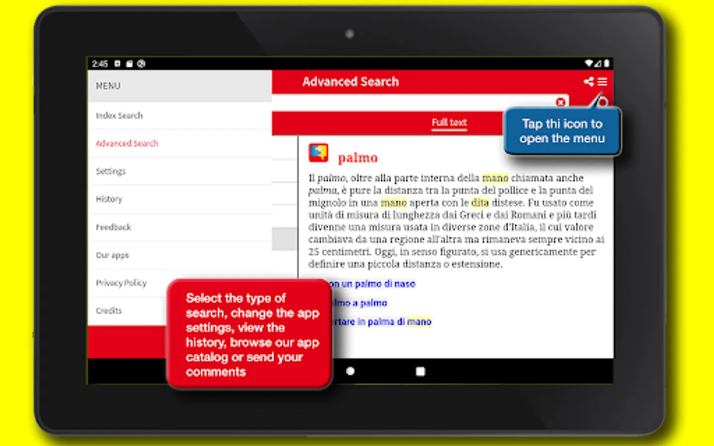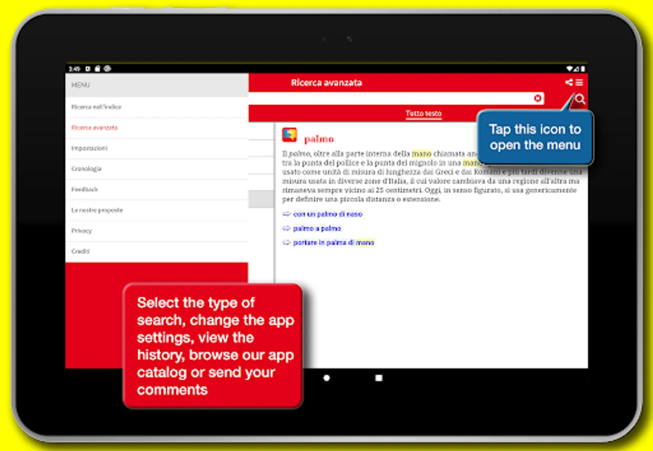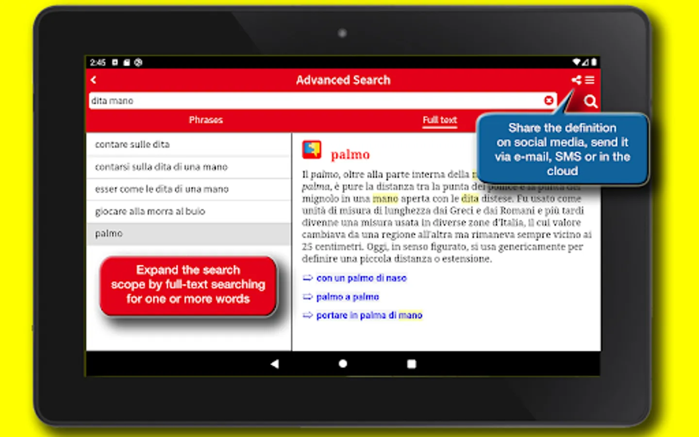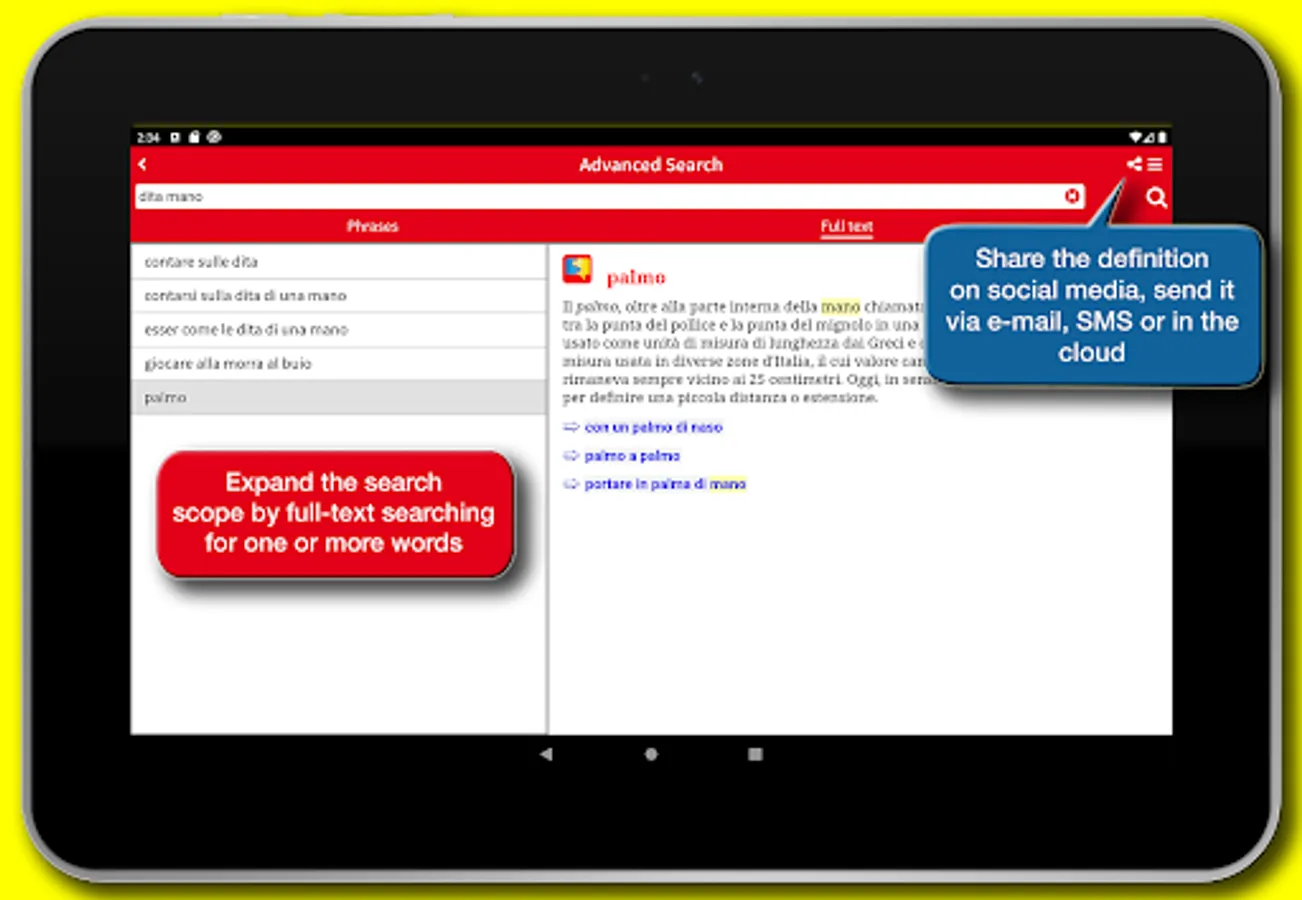 The app's interface has been redesigned to provide a simpler and more intuitive experience. Each definition can be shared using the features available in the device, such as social media, e-mail, SMS, cloud. A main menu that can be activated via an icon available at the top right of the screen enables all the features of the app: