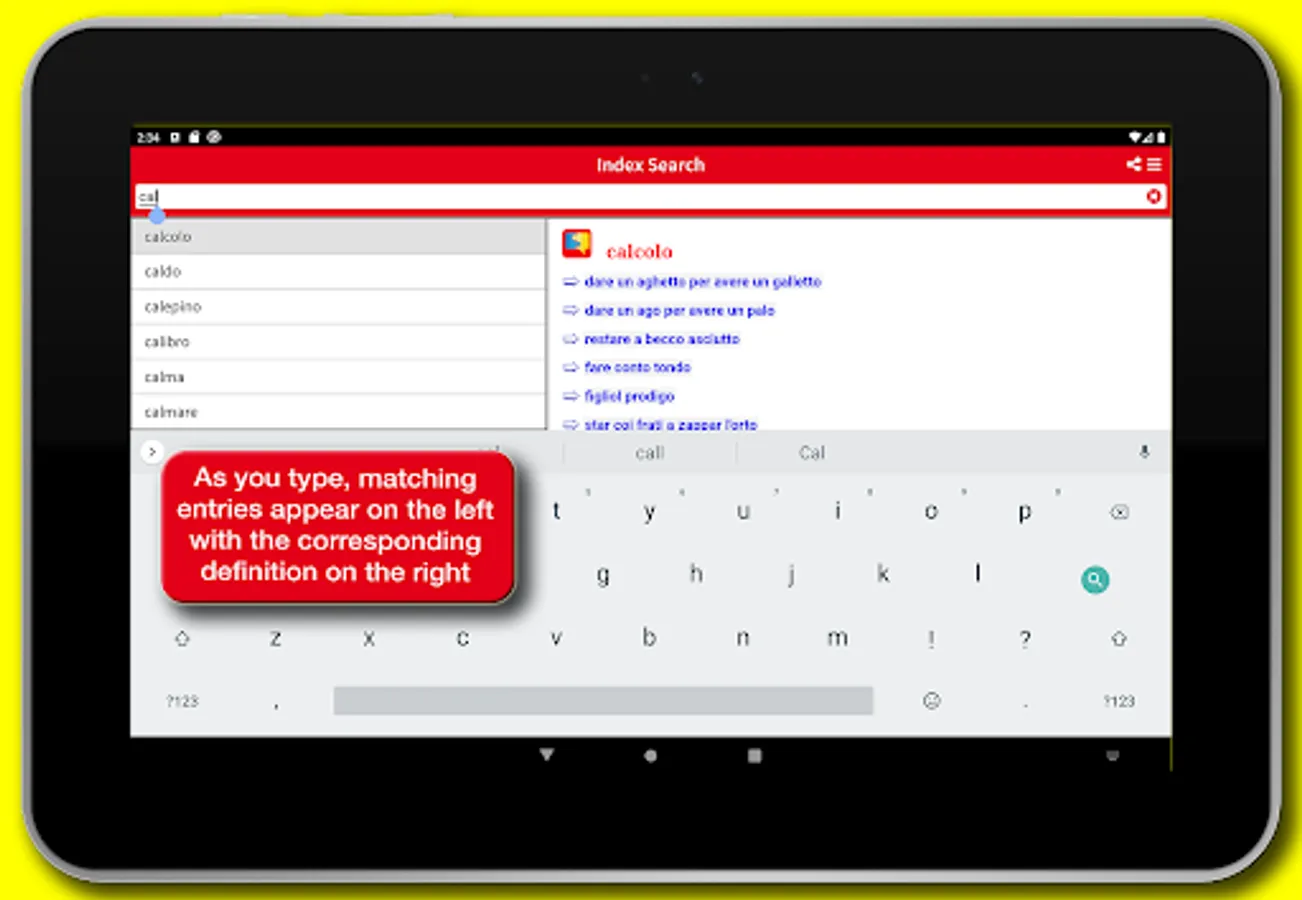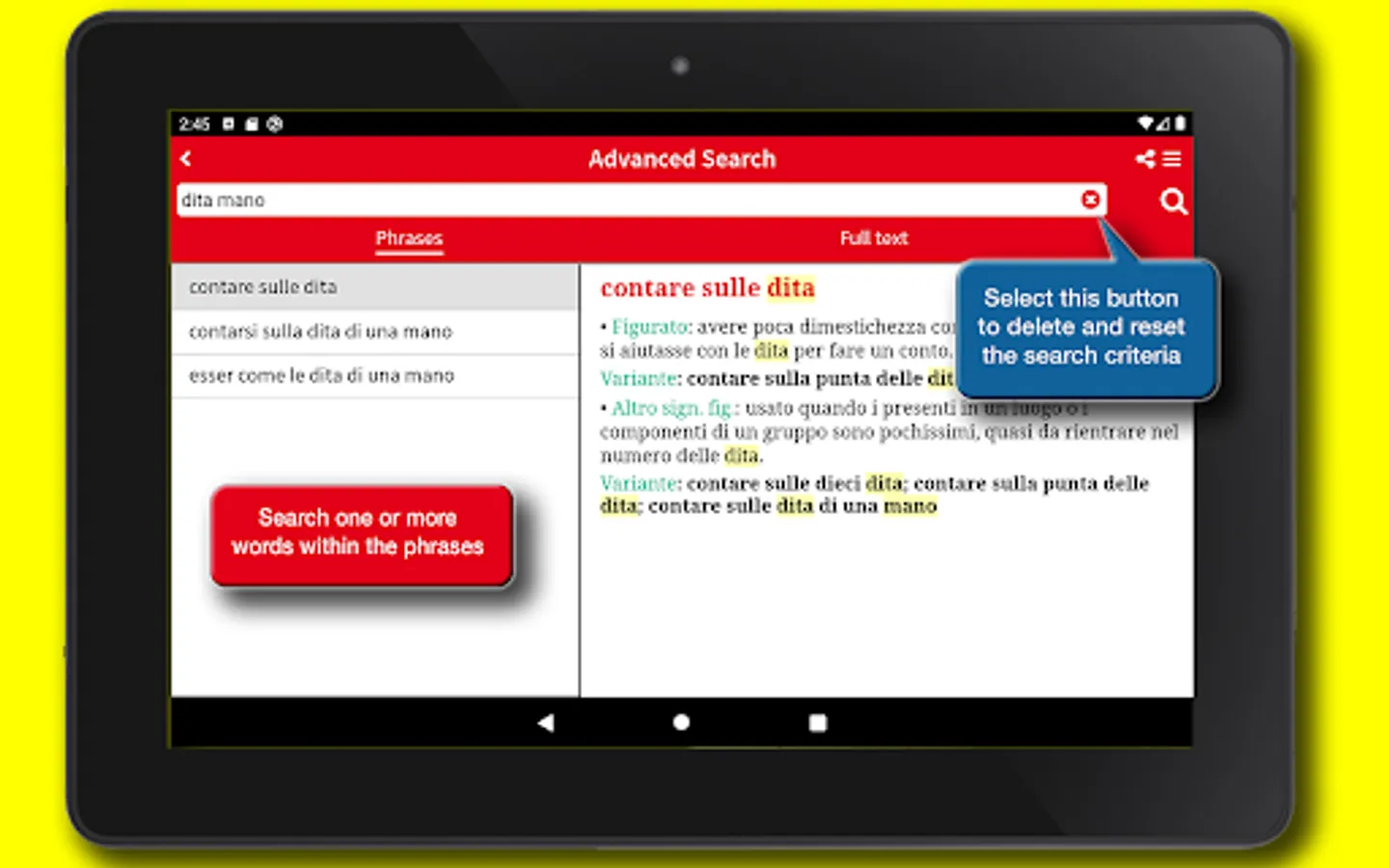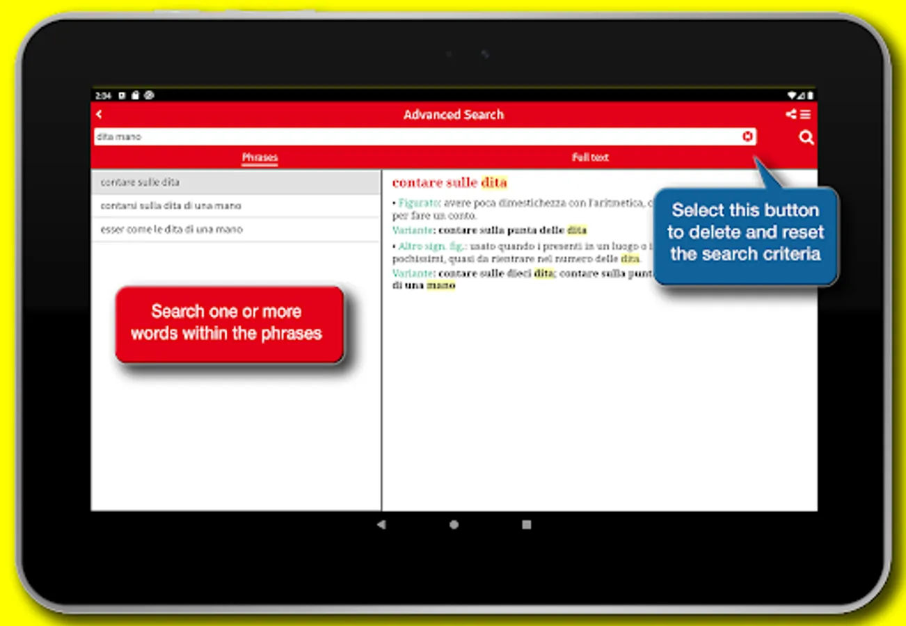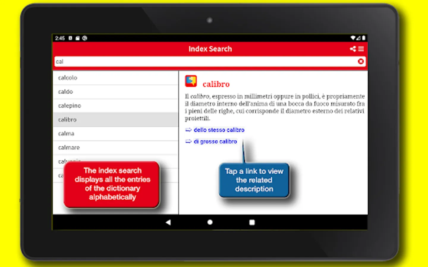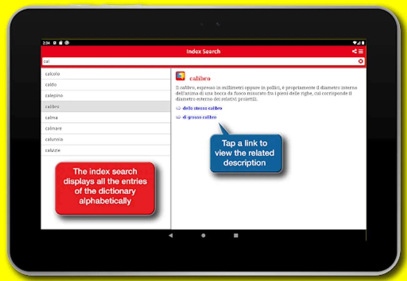The app's interface has been redesigned to provide a simpler and more intuitive experience. Each definition can be shared using the features available in the device, such as social media, e-mail, SMS, cloud. A main menu that can be activated via an icon available at the top right of the screen enables all the features of the app: