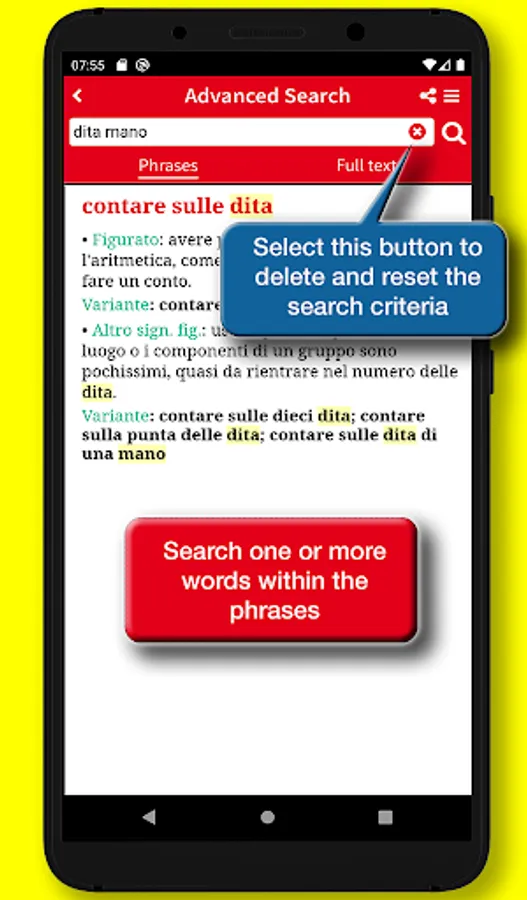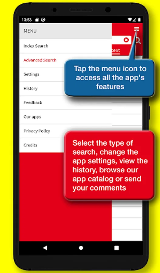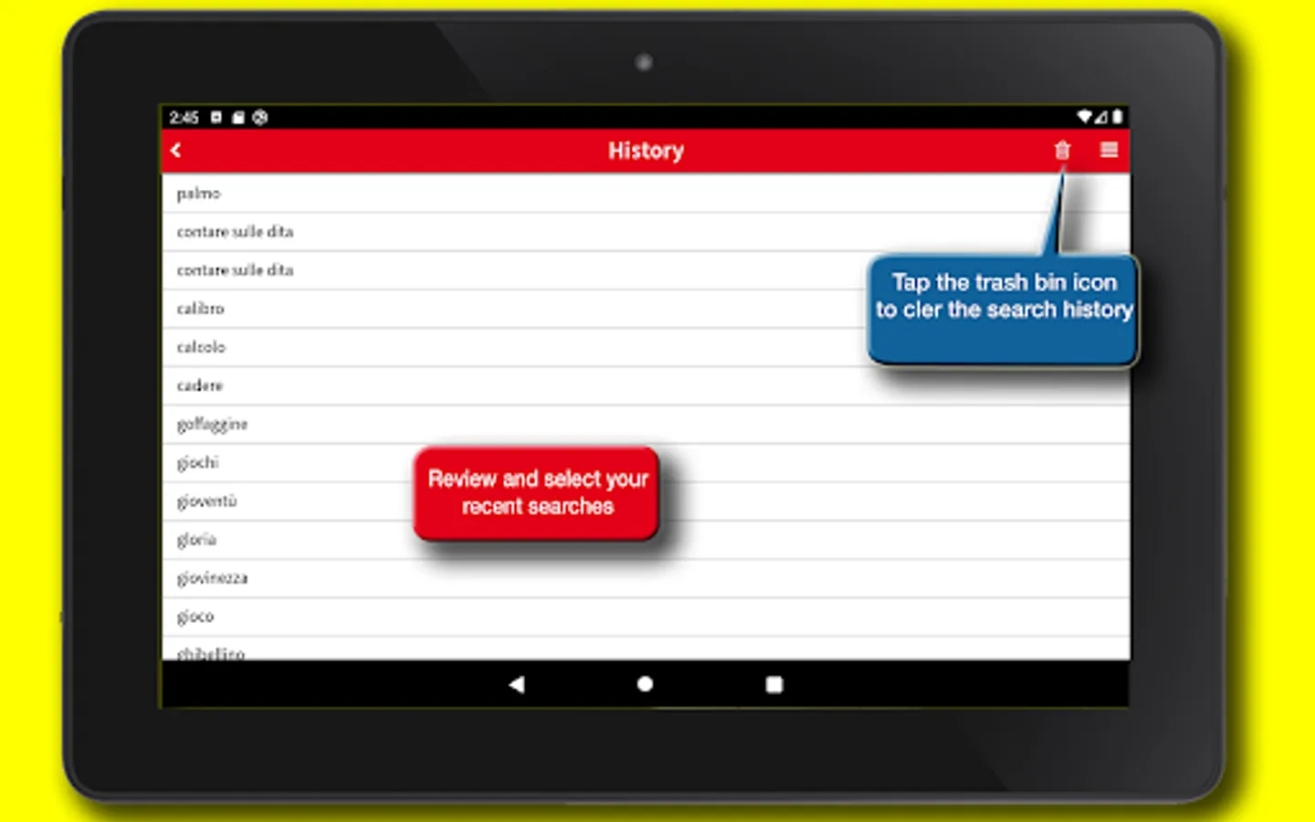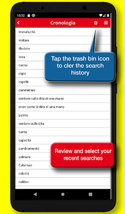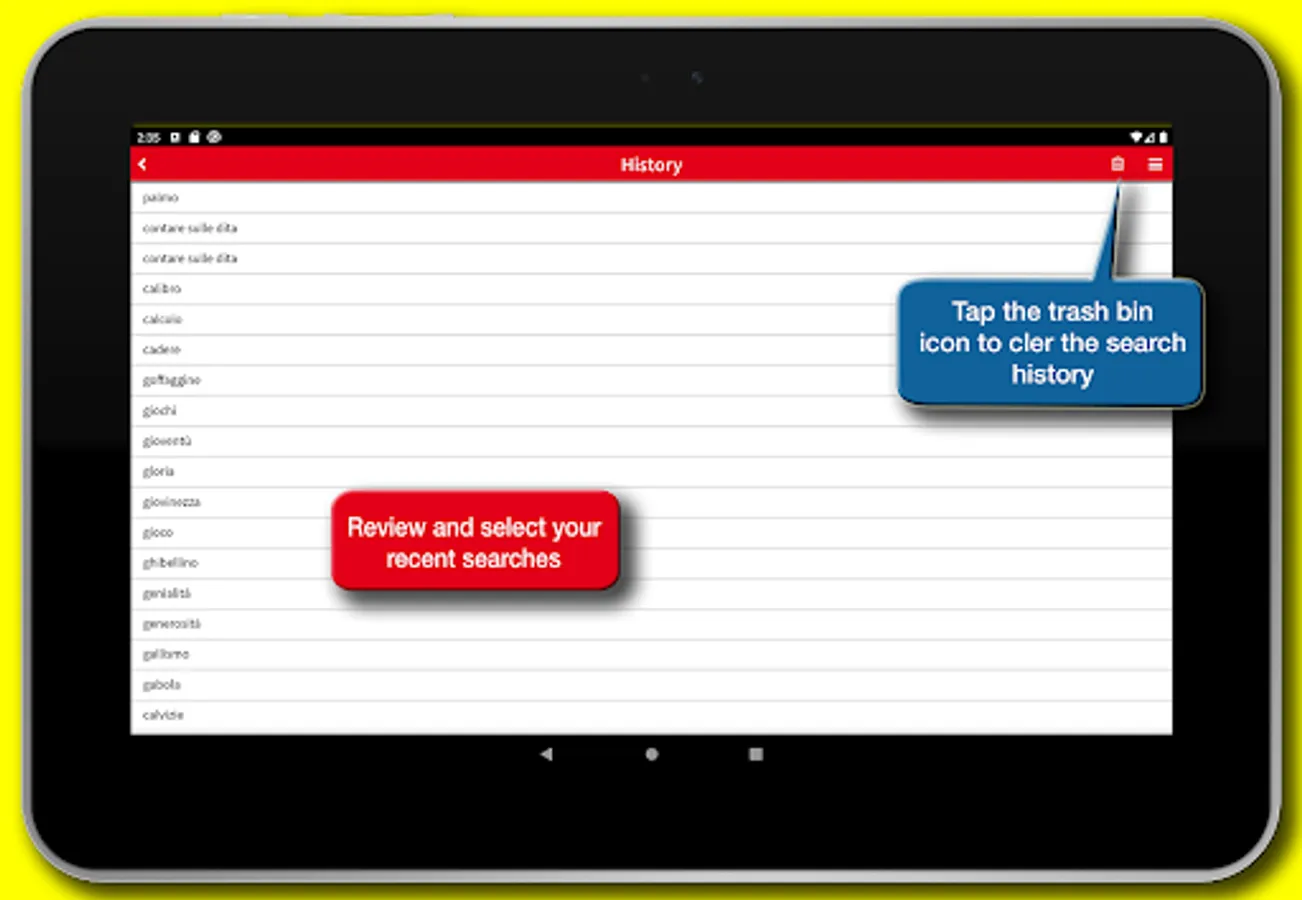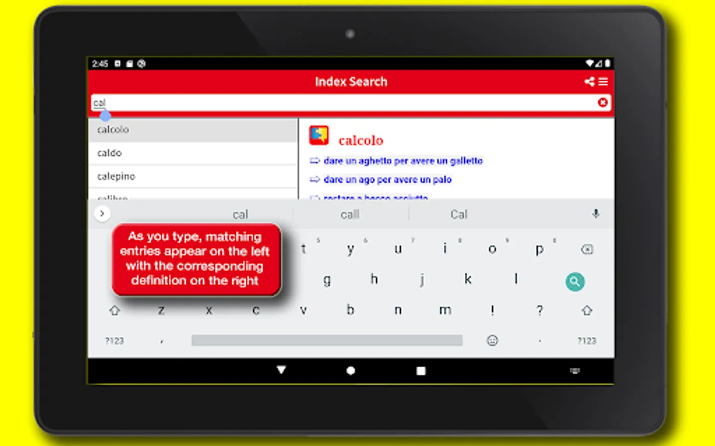 The app's interface has been redesigned to provide a simpler and more intuitive experience. Each definition can be shared using the features available in the device, such as social media, e-mail, SMS, cloud. A main menu that can be activated via an icon available at the top right of the screen enables all the features of the app: