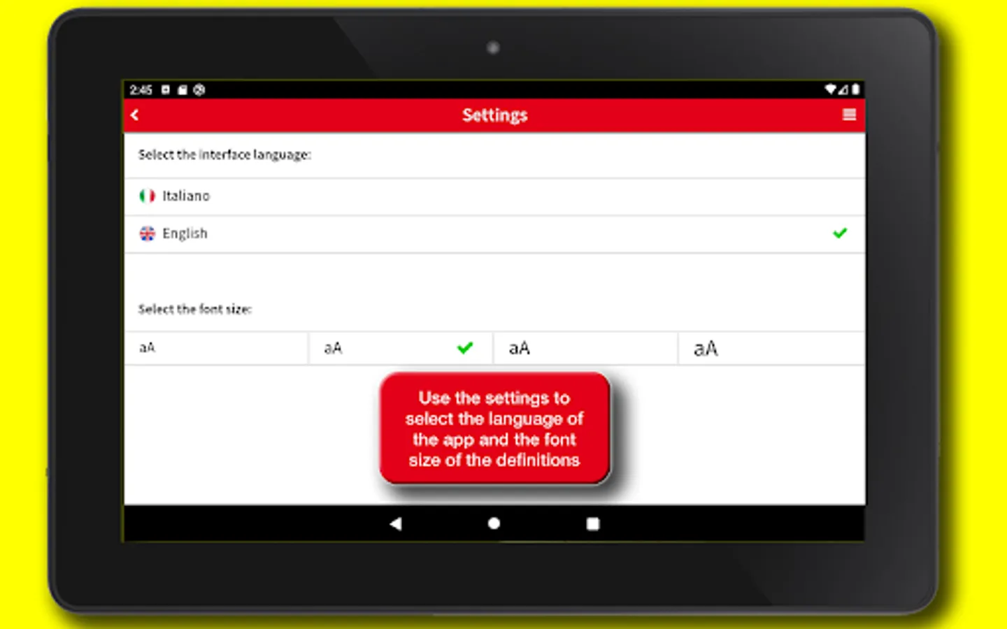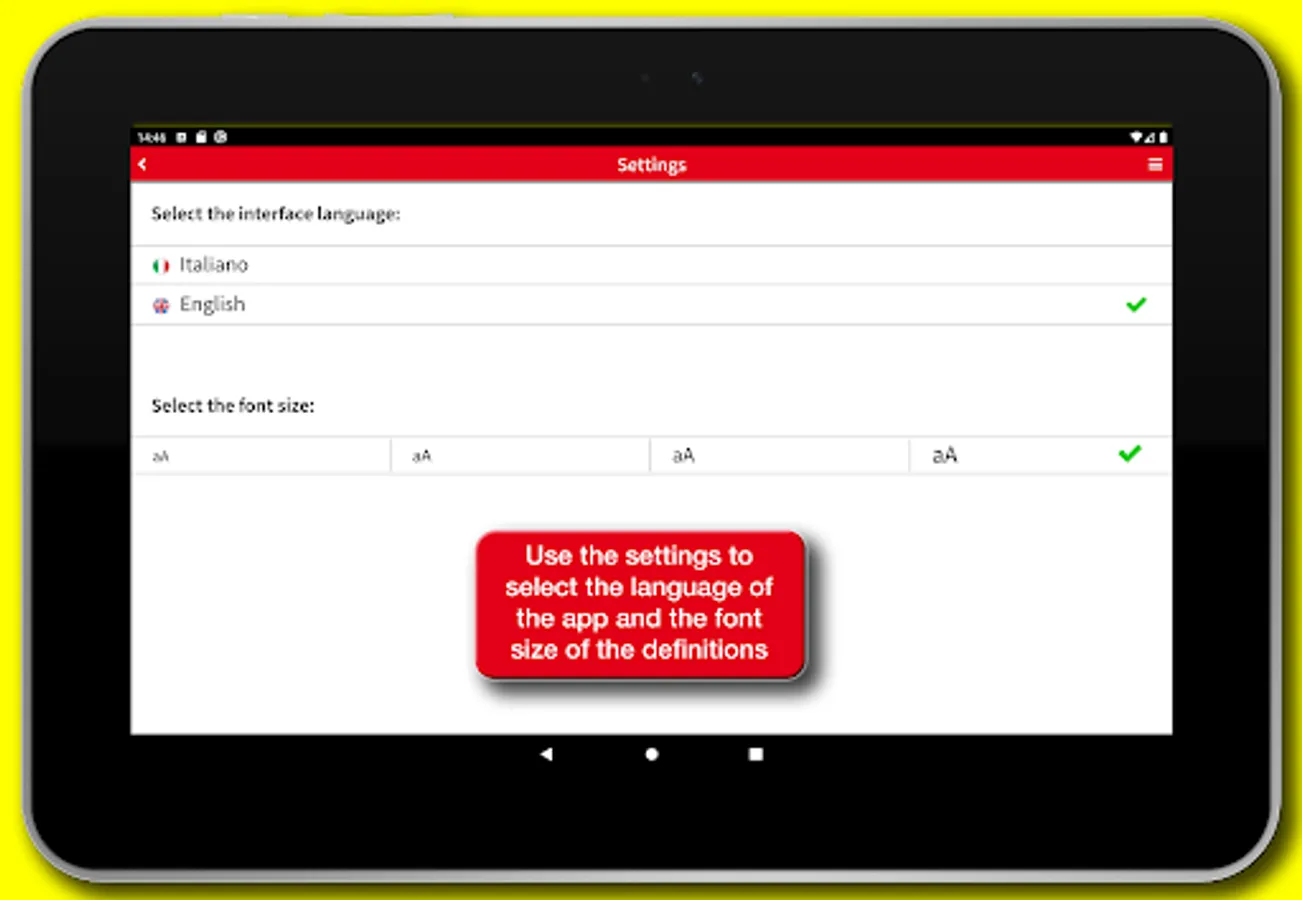 • Settings: allows you to choose the font size of the definitions and the language of the interface