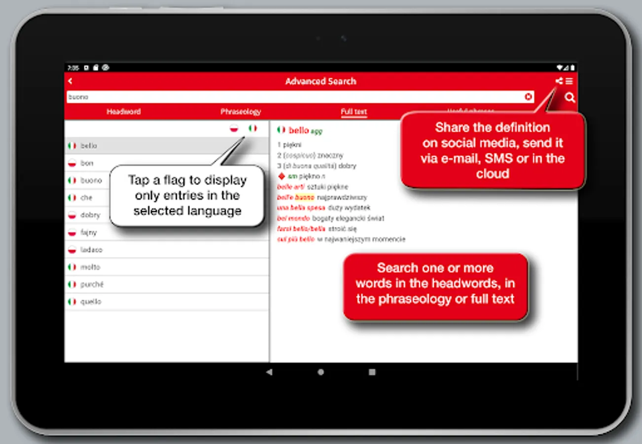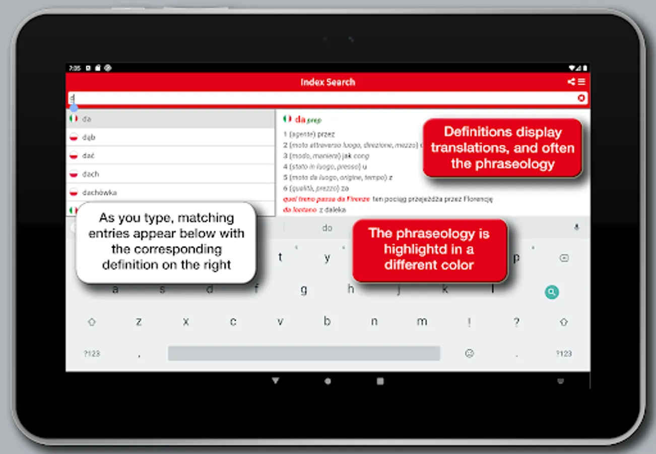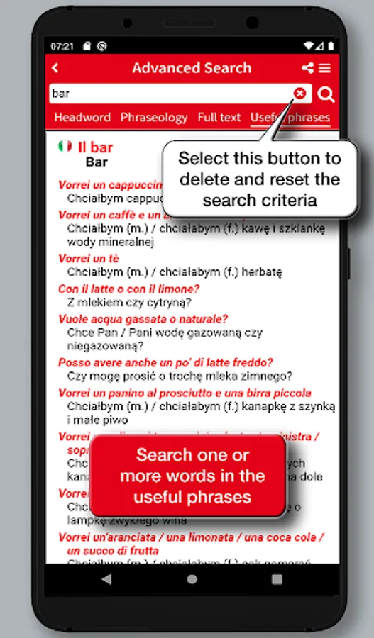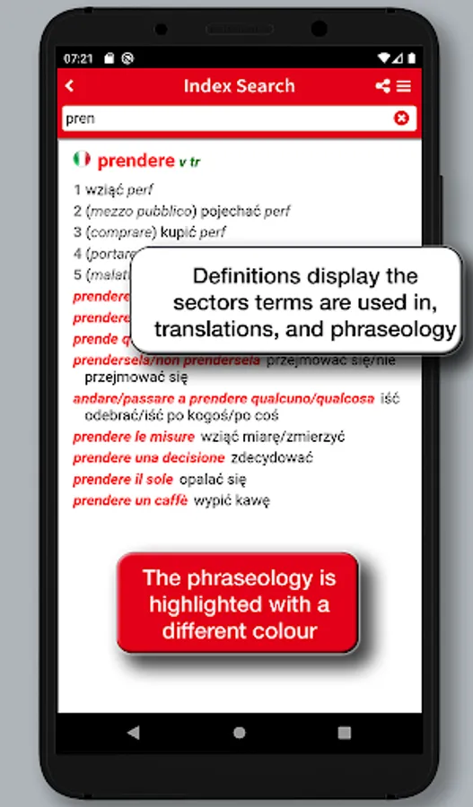 In addition to the search in the broad wordlist, the app allows you to run full-text searches and provides a useful option to search the phraseology providing for a real context of the spoken language, and making the dictionary a useful tool for quick reference as well as a safe and practical language guide for both idioms.