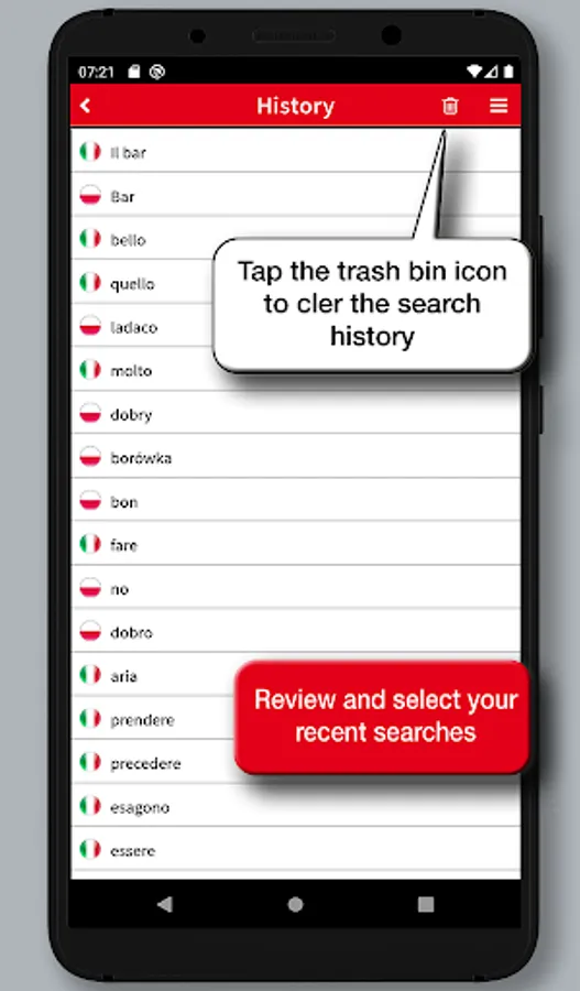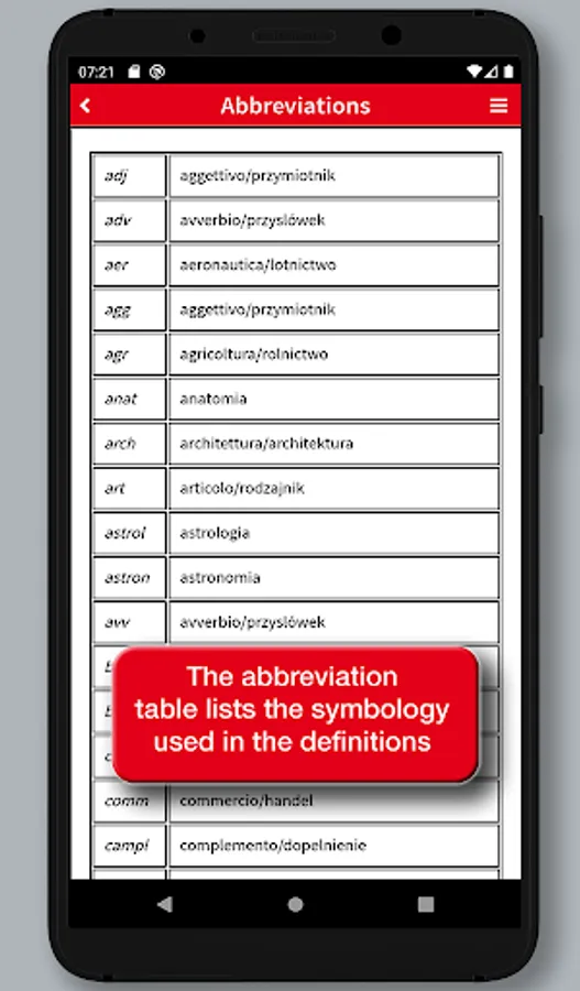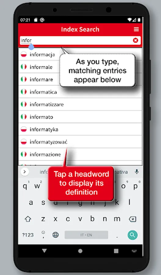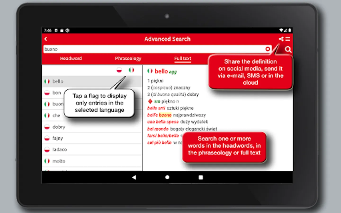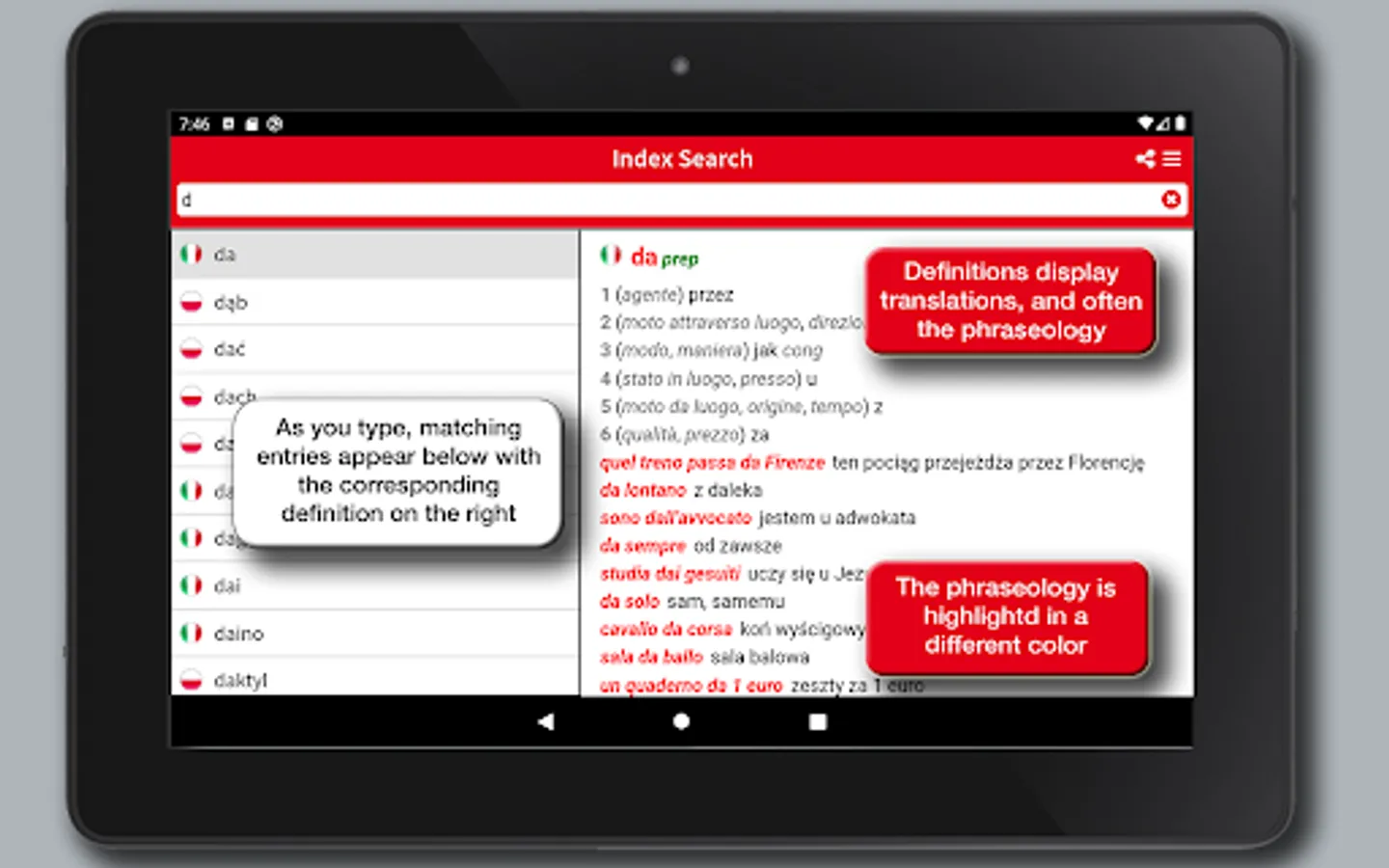 In addition to the search in the broad wordlist, the app allows you to run full-text searches and provides a useful option to search the phraseology providing for a real context of the spoken language, and making the dictionary a useful tool for quick reference as well as a safe and practical language guide for both idioms.