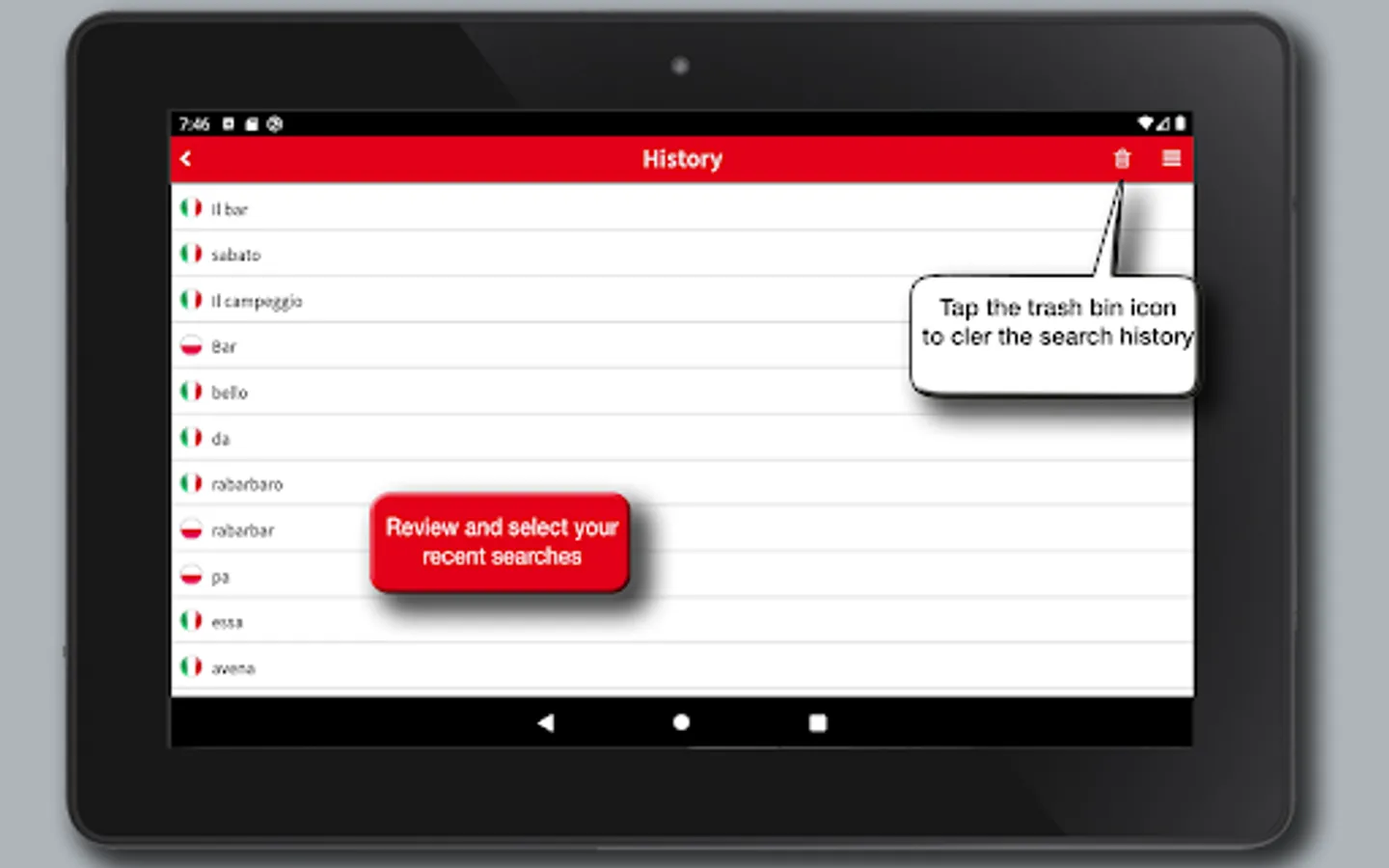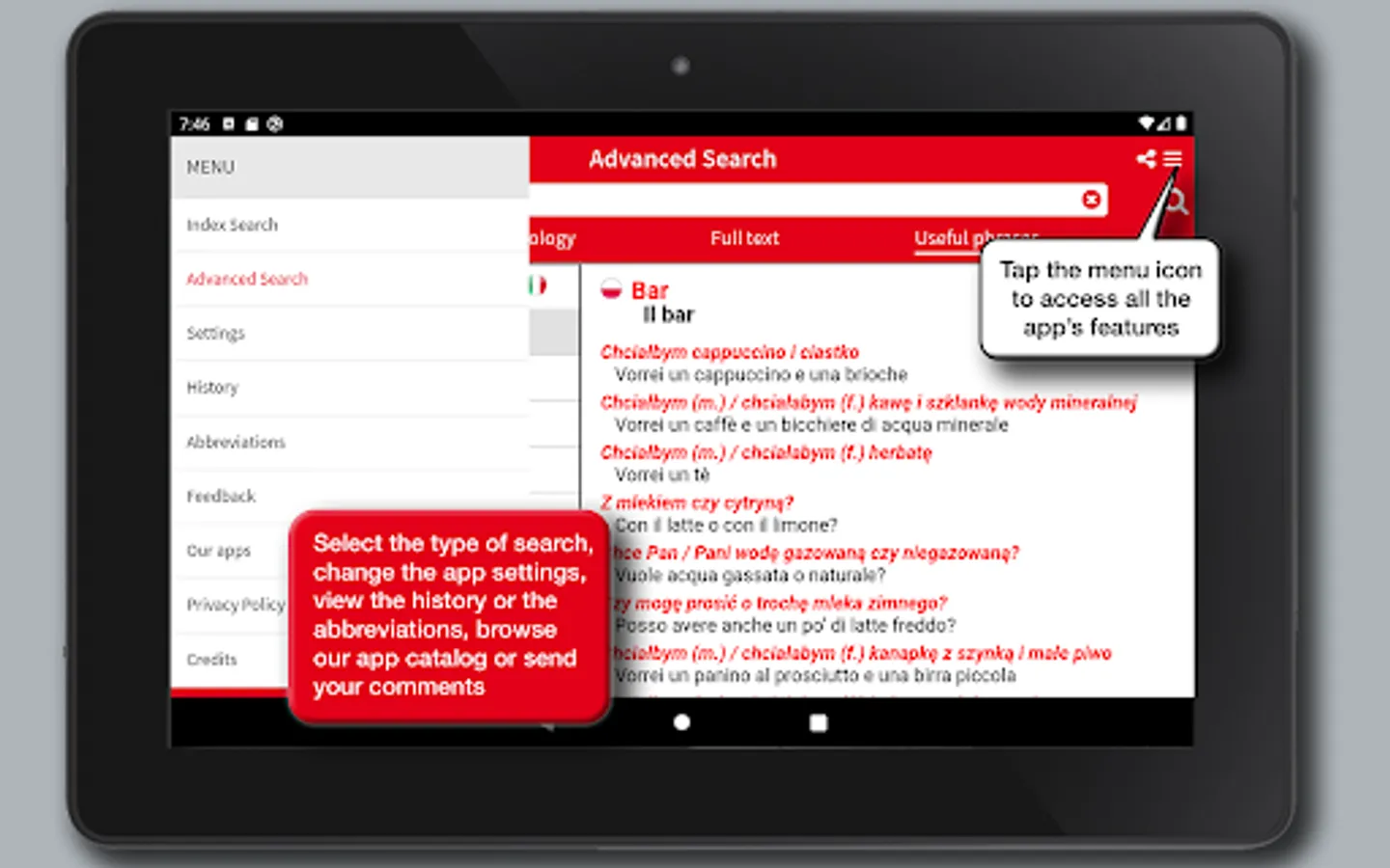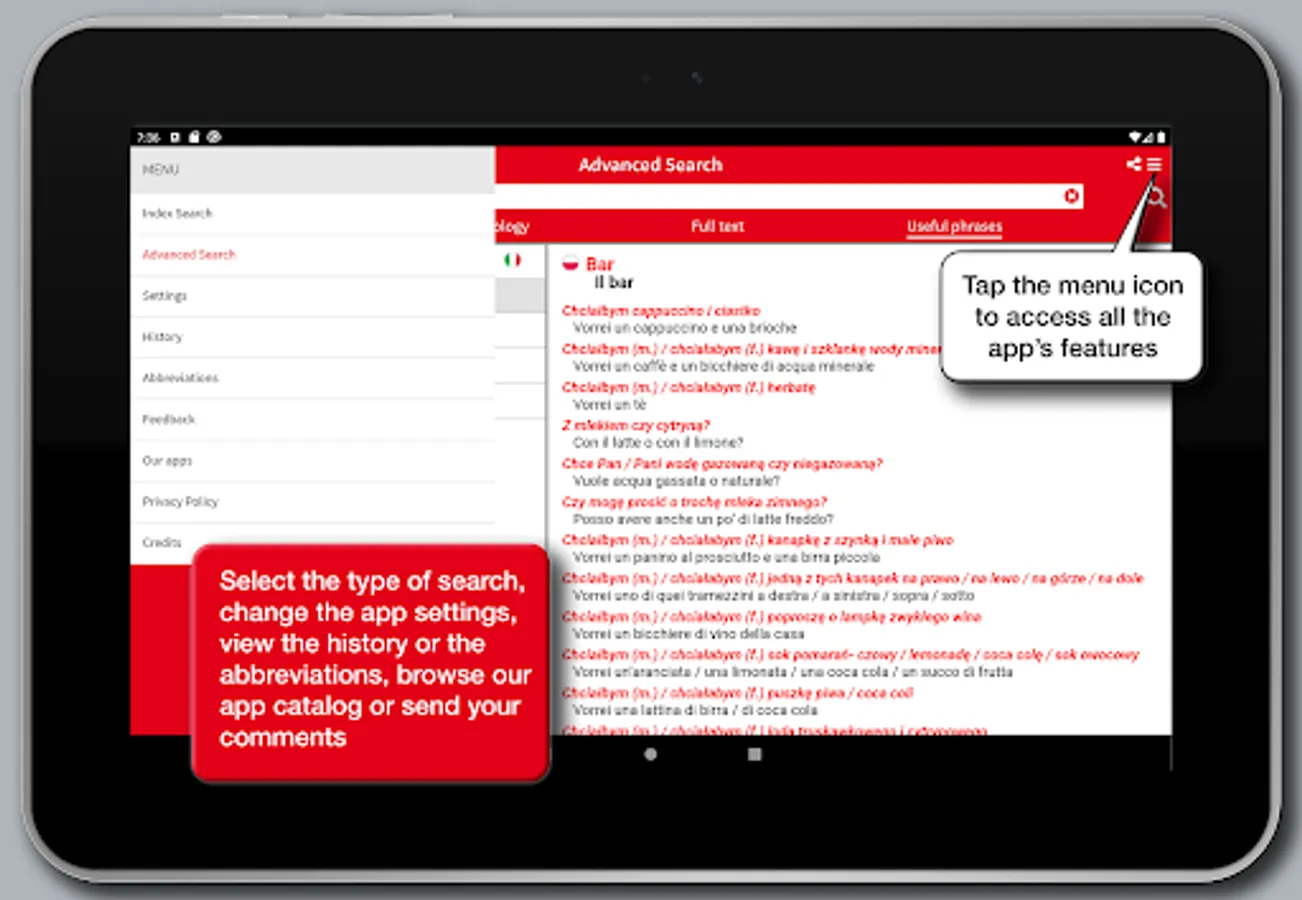 A useful phrases search option further contributes to the learning of the language providing the building blocks for a quick orientation in the most common situations and places: from greetings to presentations, from the bar to the restaurant, from emergency situations to public transportation as well as all the useful phrases for tourists.