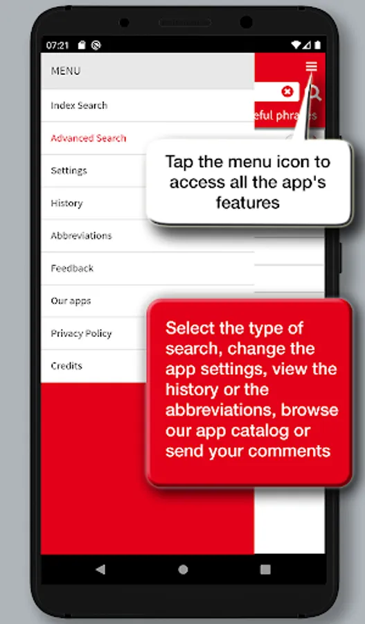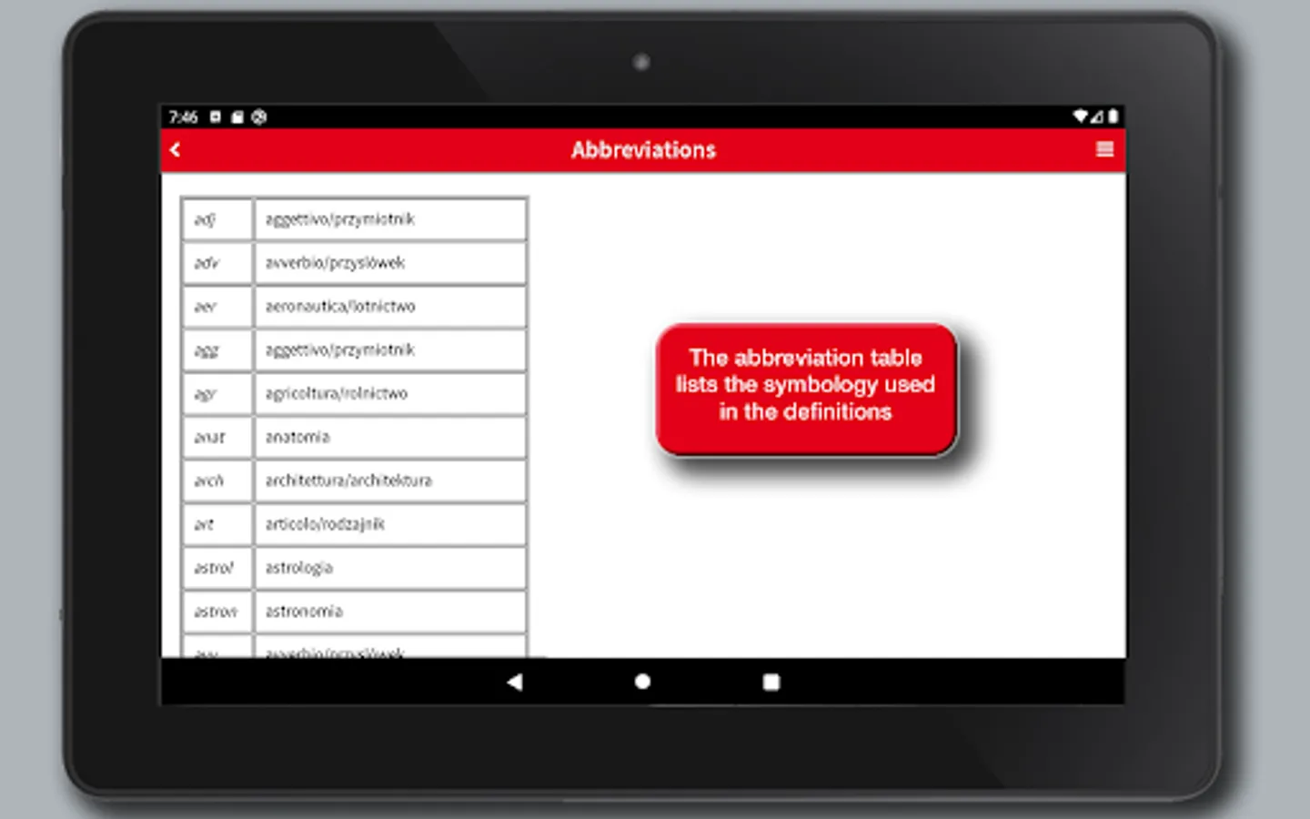The app's interface has been redesigned to provide a simpler and more intuitive experience. Each definition can be shared using the features available in the device, such as social media, e-mail, SMS, cloud. A main menu that can be activated via an icon available at the top right of the screen enables all the features of the app:
