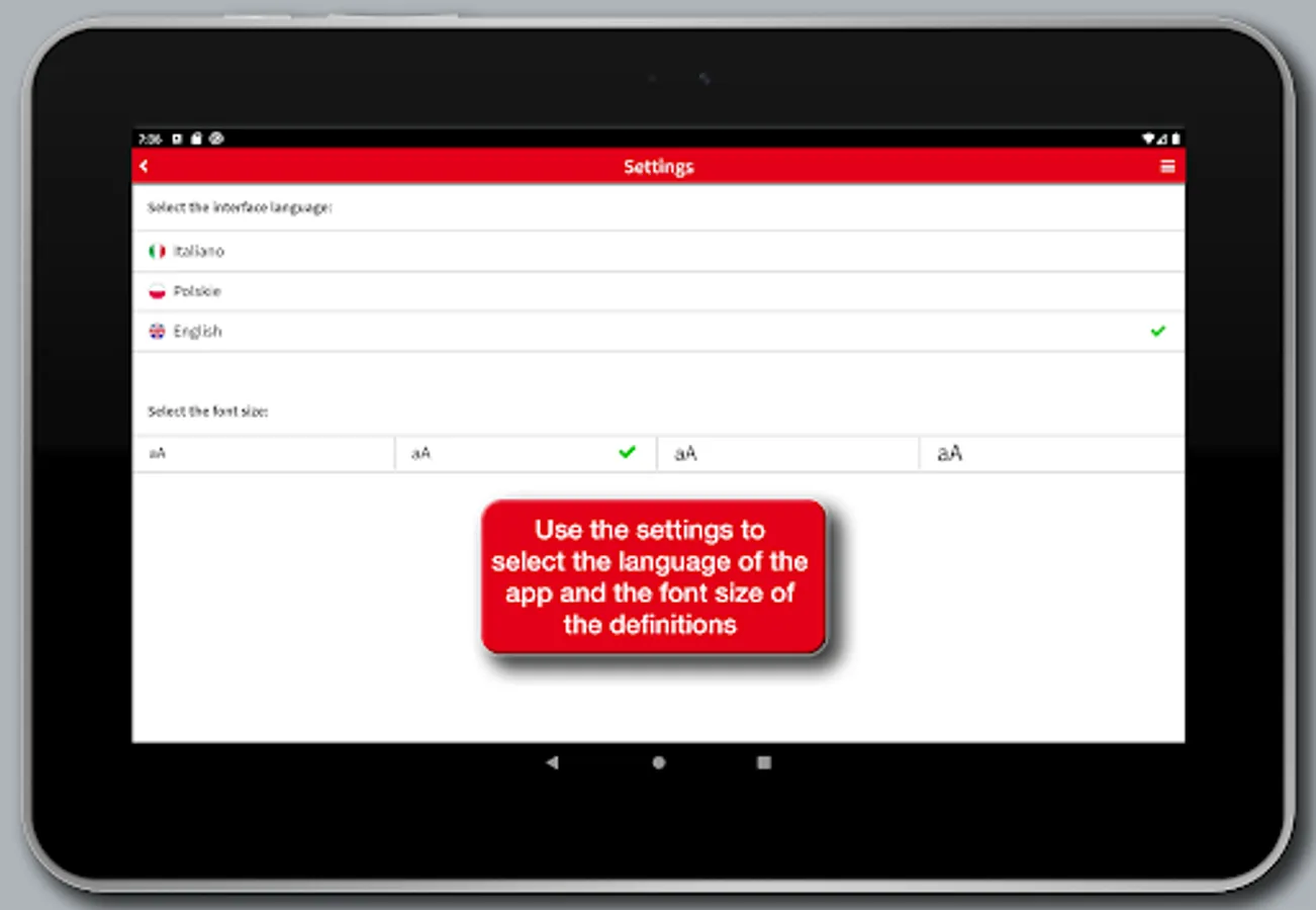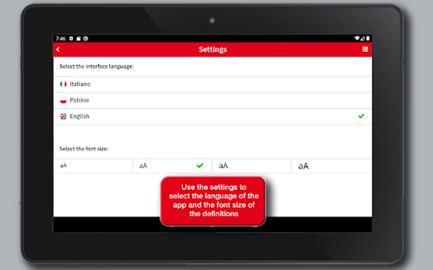• Settings: allows you to choose the font size of the definitions and the language of the interface