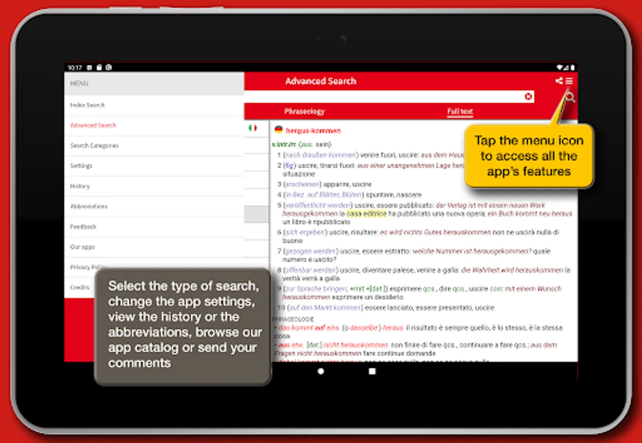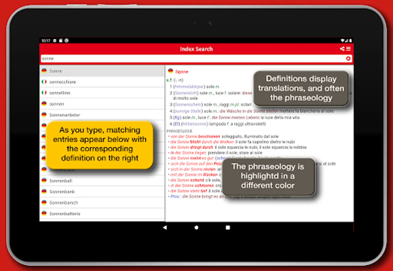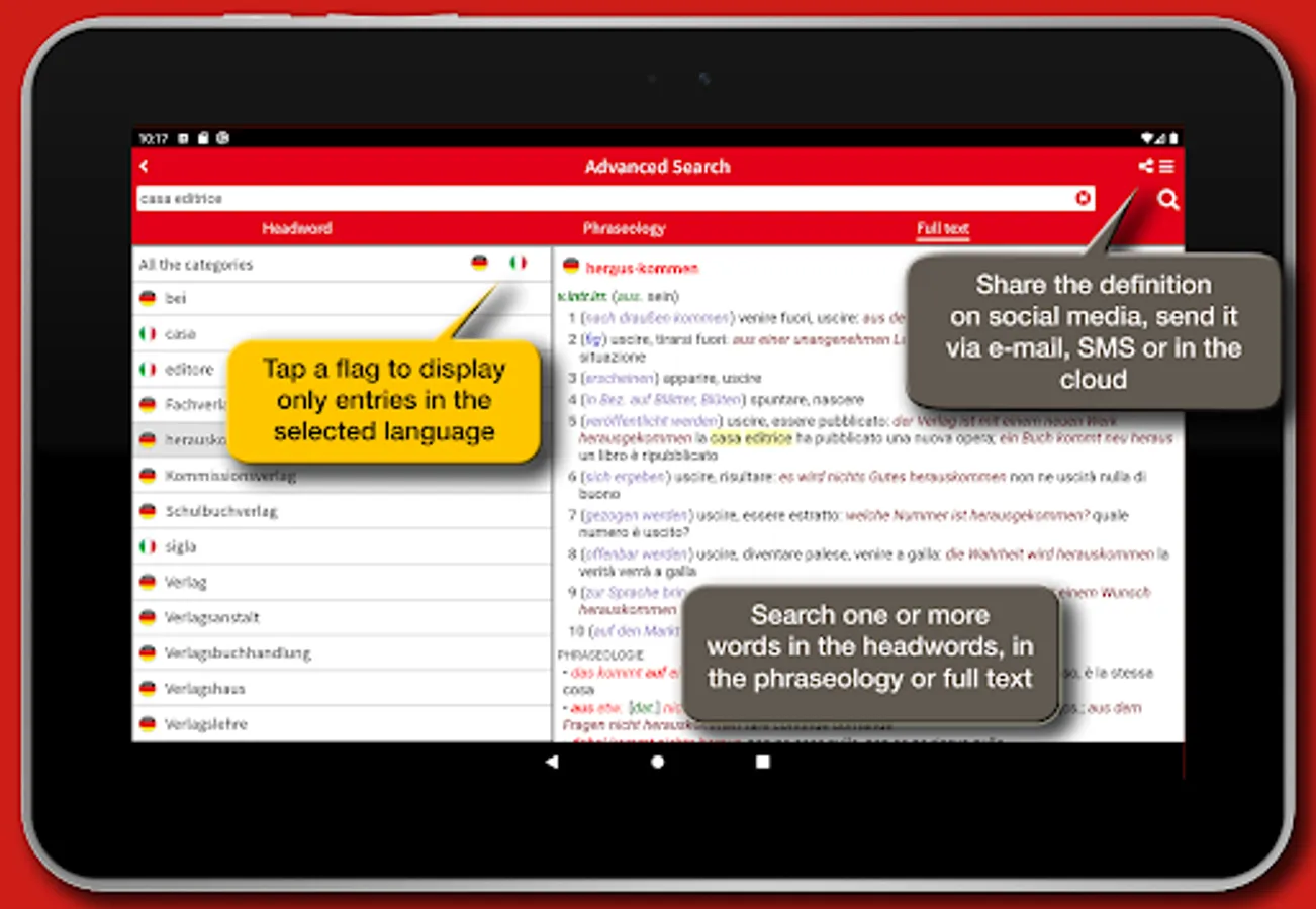 Entirely reworked and updated on the basis of the historical volume created by the Sansoni Lexicographic Center led by Vladimiro Macchi, this app provide a dictionary that responds to the need to follow the continuous evolution of the German language. As well as being a comprehensive and up-to-date German-Italian dictionary as far as specialist scientific terminology is concerned, it also provides a record of the linguistic heritage of both languages, including that of the forms of German spoken in Austria and Switzerland.