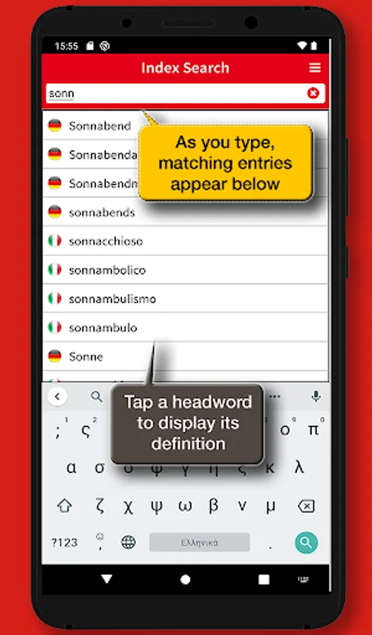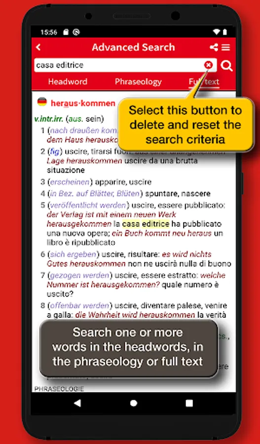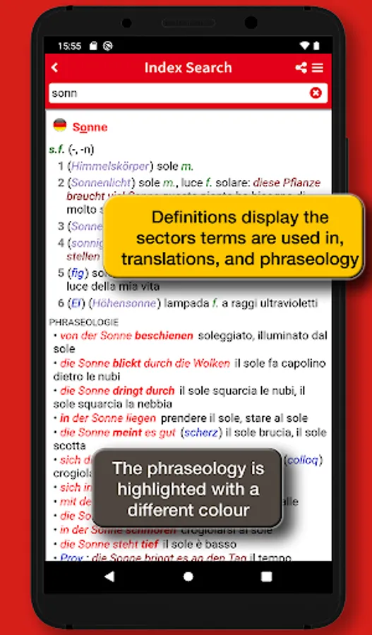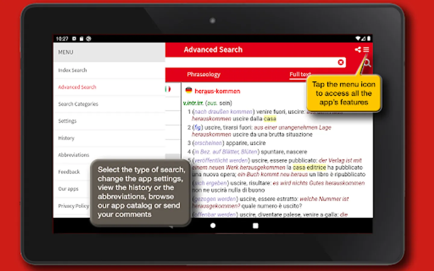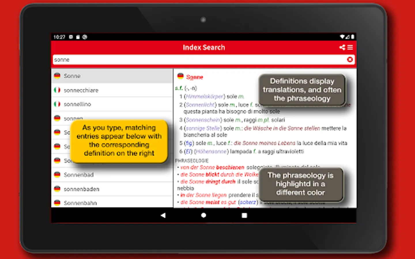 Entirely reworked and updated on the basis of the historical volume created by the Sansoni Lexicographic Center led by Vladimiro Macchi, this app provide a dictionary that responds to the need to follow the continuous evolution of the German language. As well as being a comprehensive and up-to-date German-Italian dictionary as far as specialist scientific terminology is concerned, it also provides a record of the linguistic heritage of both languages, including that of the forms of German spoken in Austria and Switzerland.