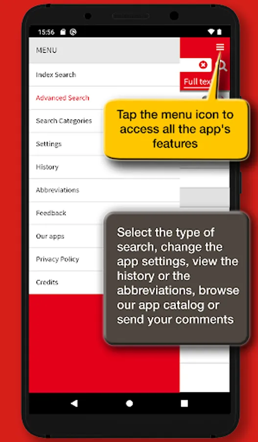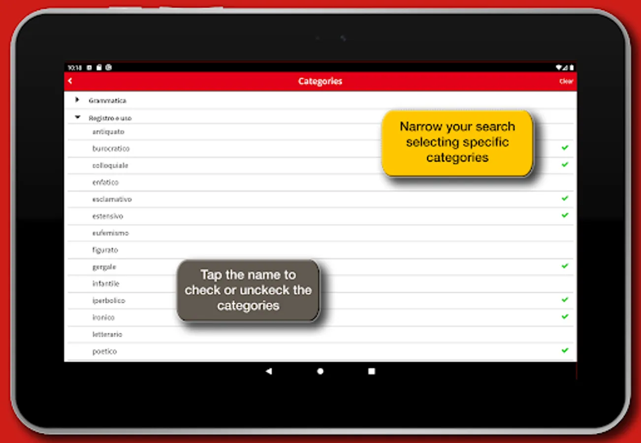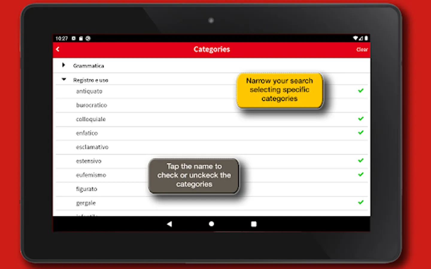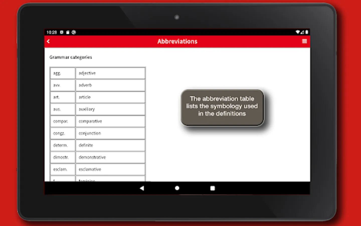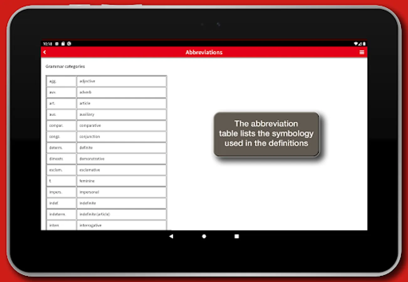 The app's interface has been redesigned to provide a simpler and more intuitive experience. Each definition can be shared using the features available in the device, such as social media, e-mail, SMS, cloud. A main menu that can be activated via an icon available at the top right of the screen enables all the features of the app: