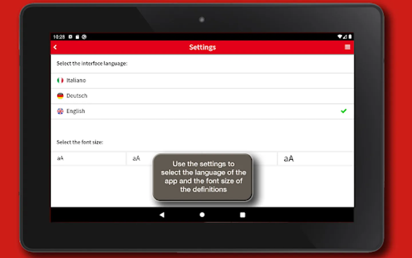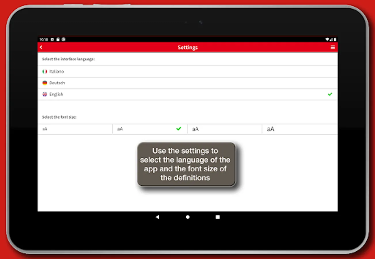 • Settings: allows you to choose the font size of the definitions and the language of the interface