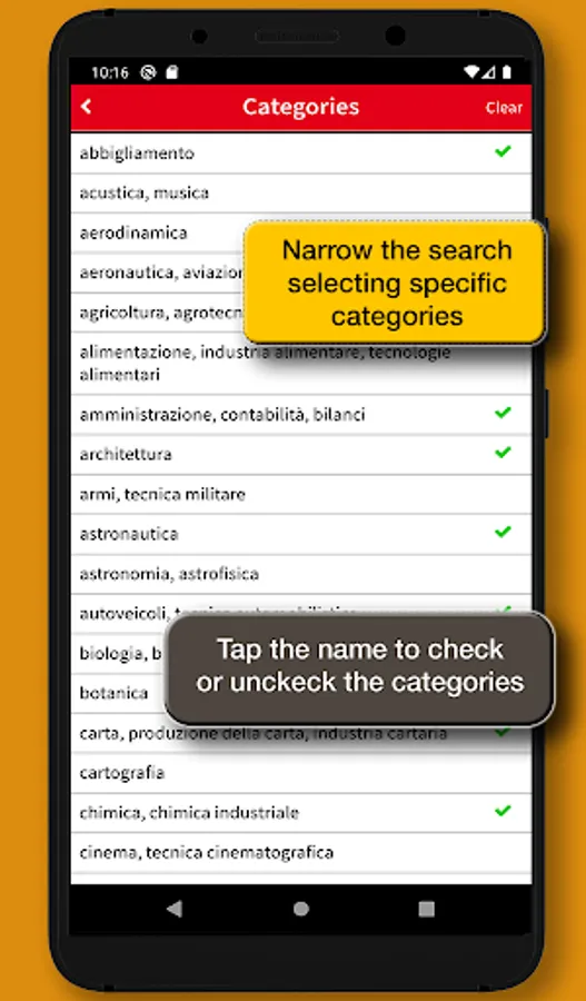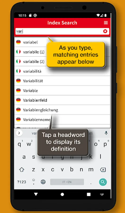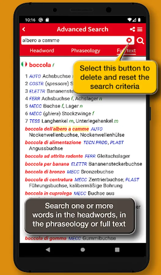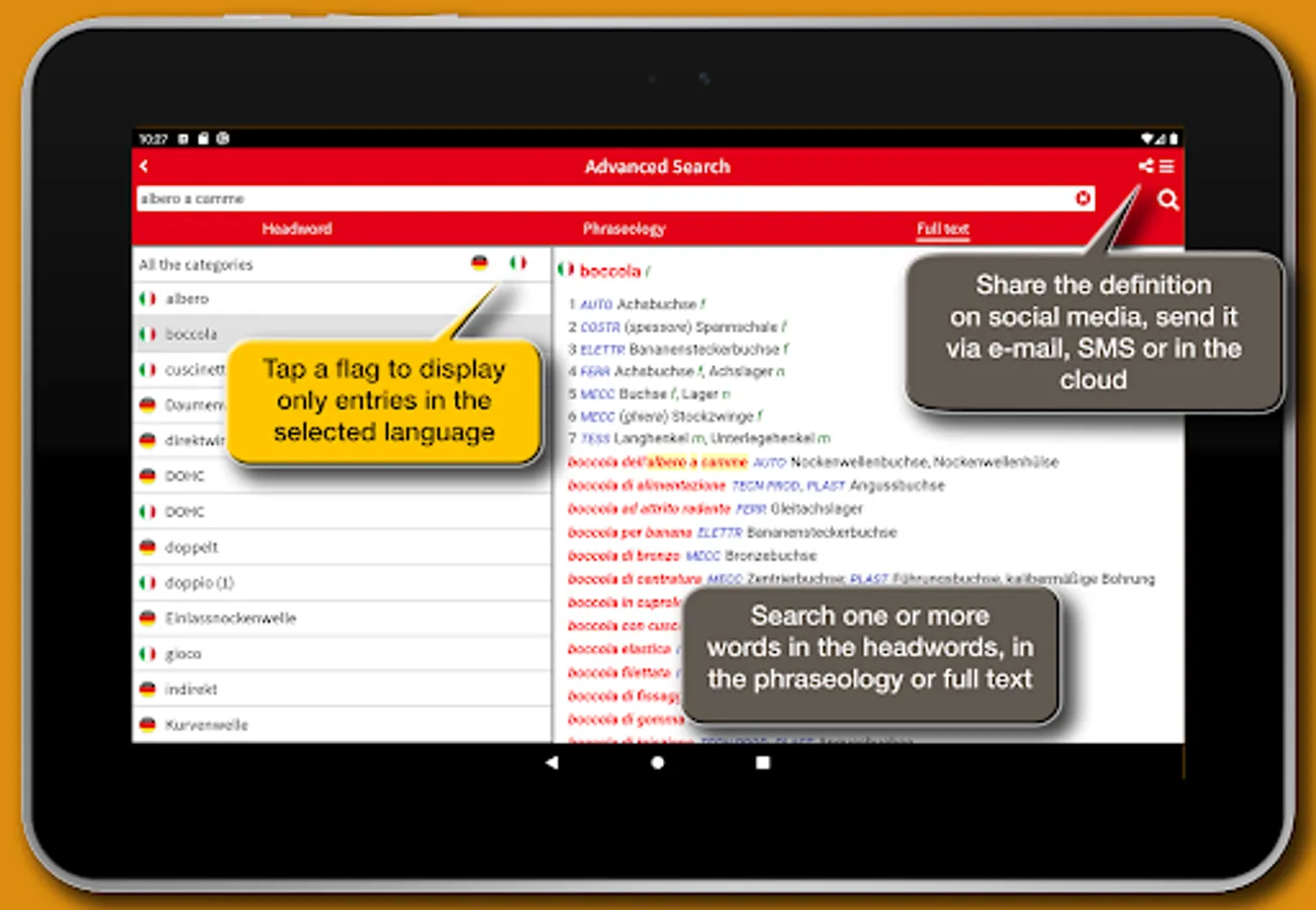 The app confirms the unanimously recognized characteristics of this kind of new generation reference tools published by Hoepli: quality and modernity of the contents associated with a wide selection of entries accompanied by numerous examples of use and a wide and accurate choice of locutions.
