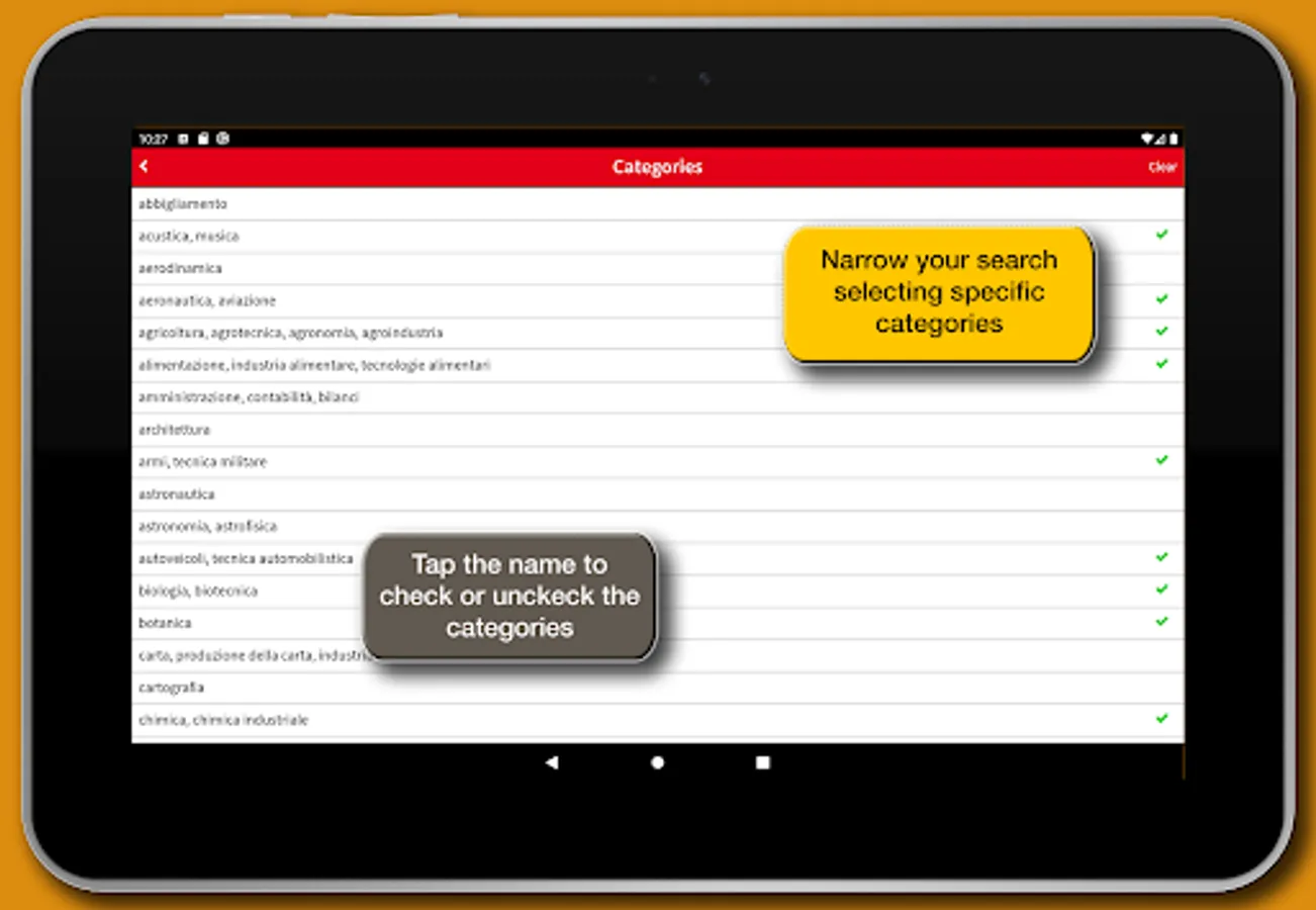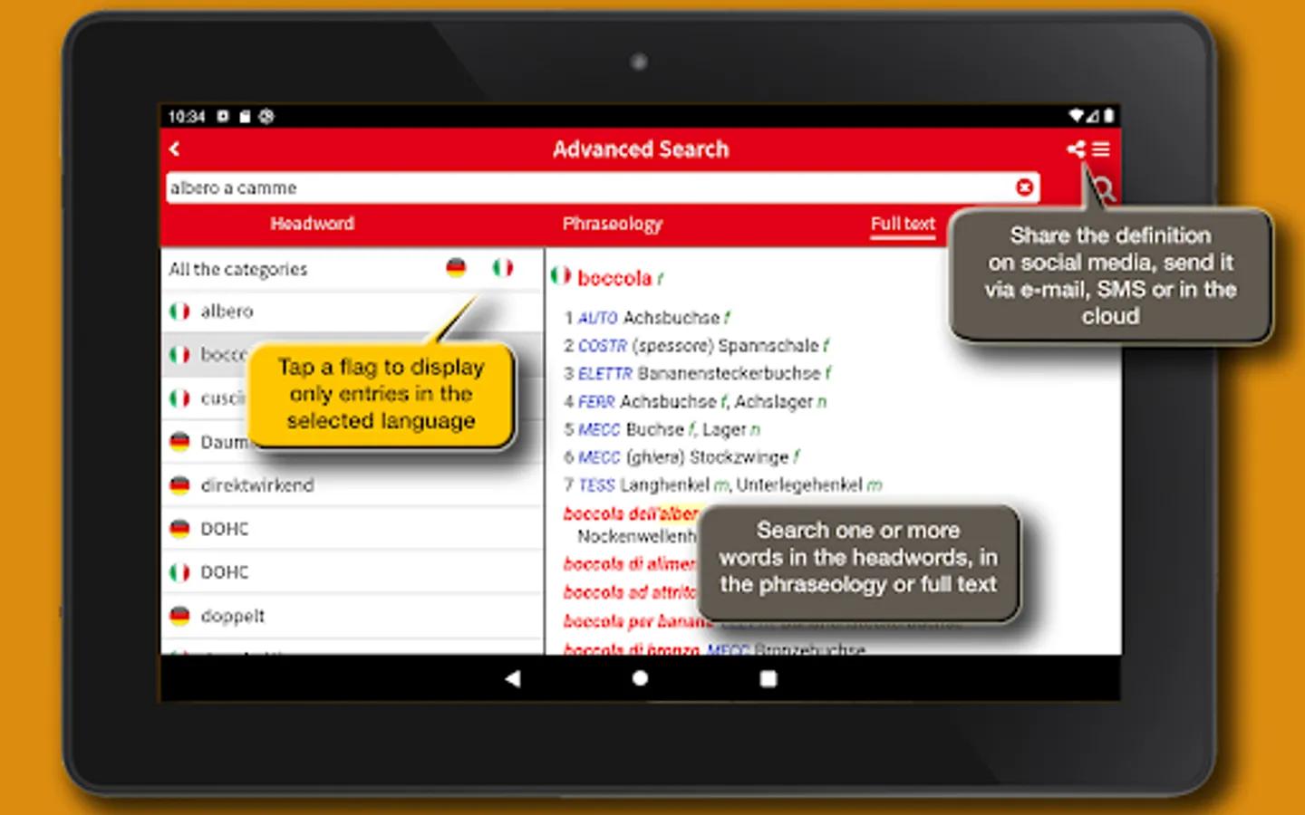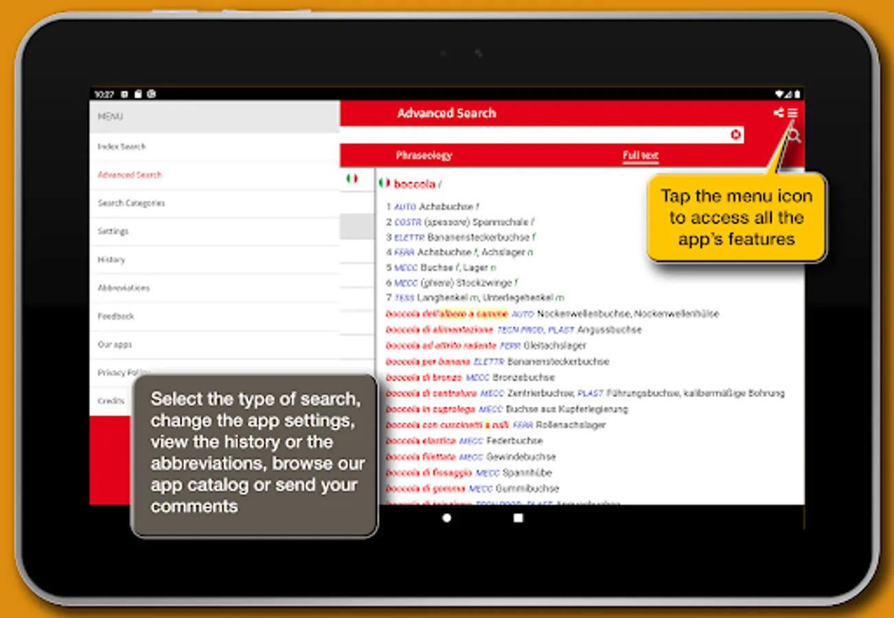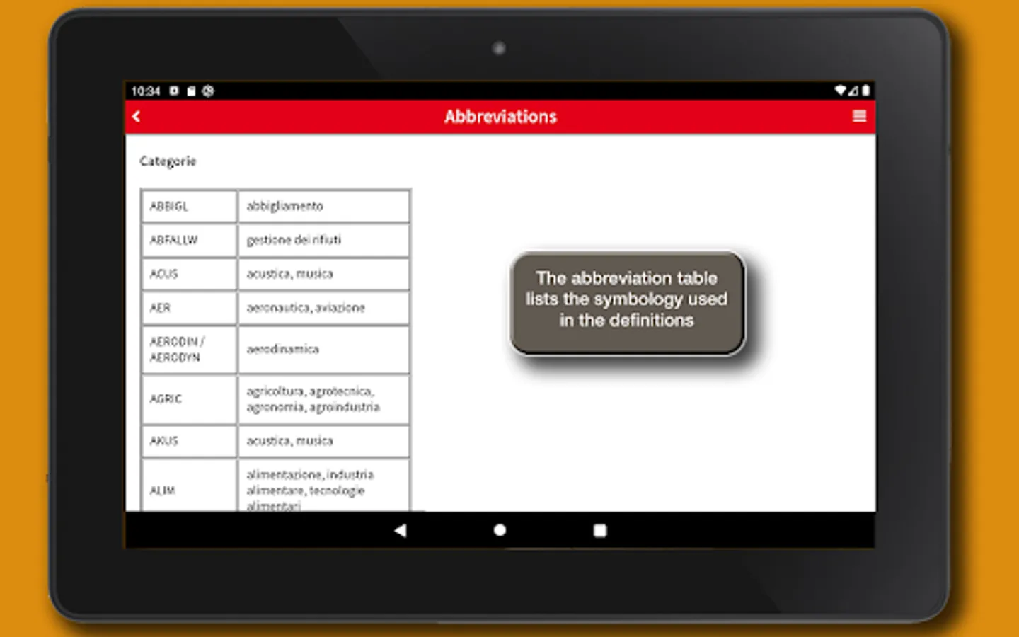 The app's interface has been redesigned to provide a simpler and more intuitive experience. Each definition can be shared using the features available in the device, such as social media, e-mail, SMS, cloud. A main menu that can be activated via an icon available at the top right of the screen enables all the features of the app: