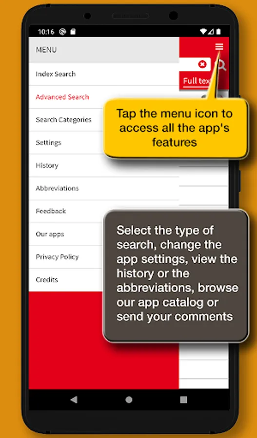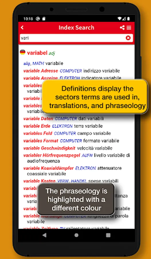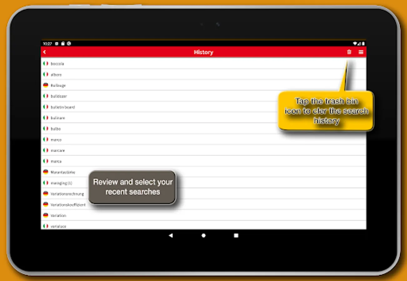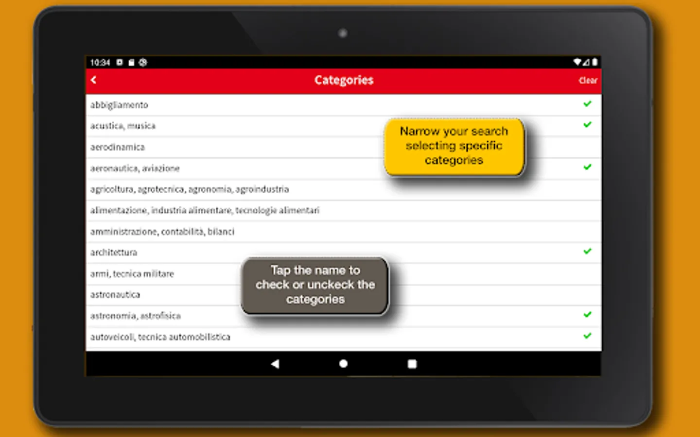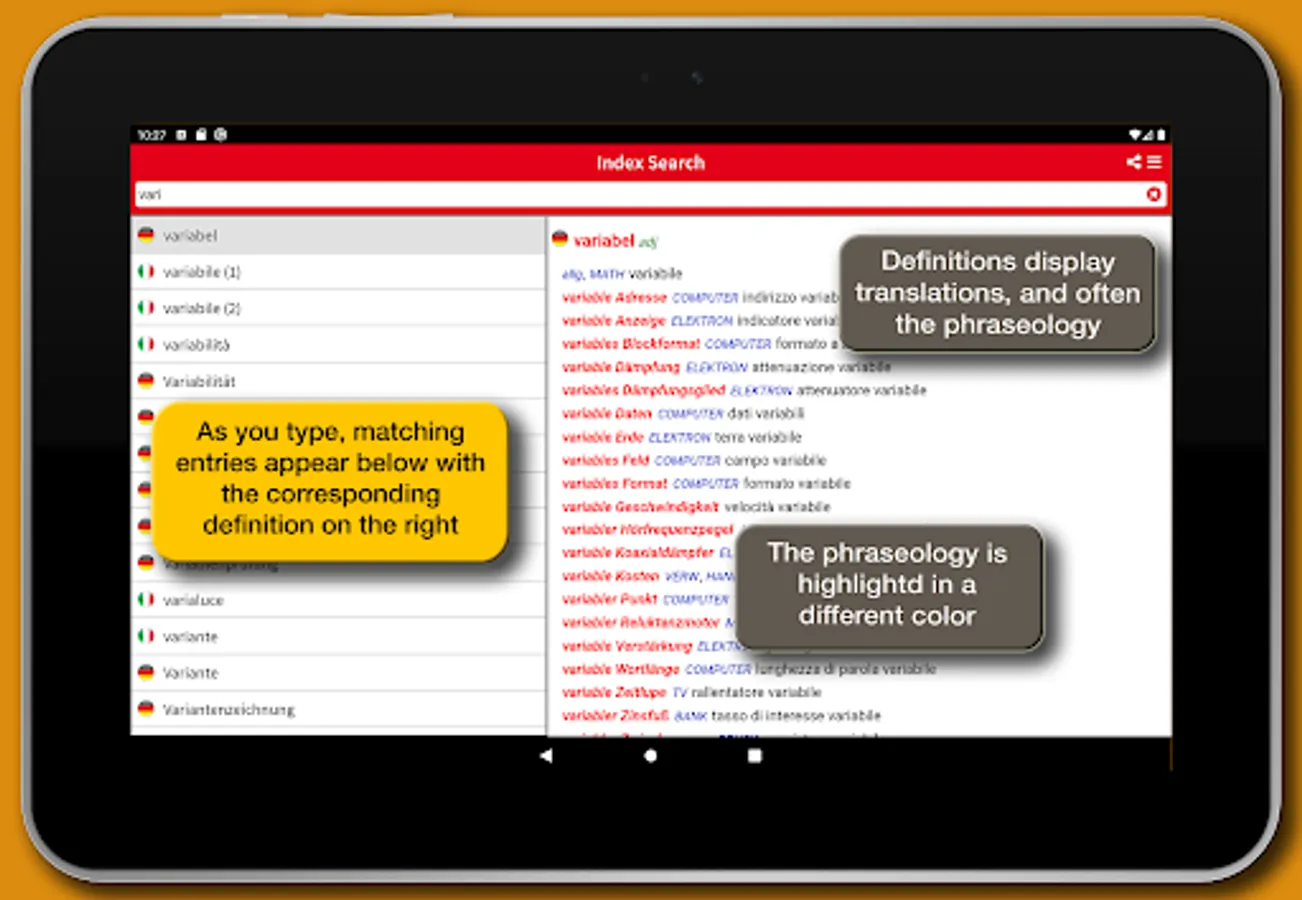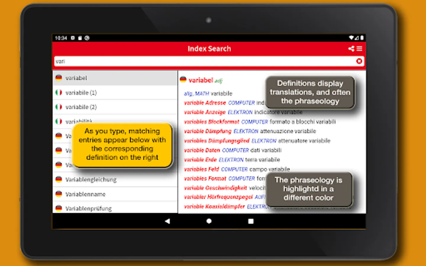 The app's interface has been redesigned to provide a simpler and more intuitive experience. Each definition can be shared using the features available in the device, such as social media, e-mail, SMS, cloud. A main menu that can be activated via an icon available at the top right of the screen enables all the features of the app: