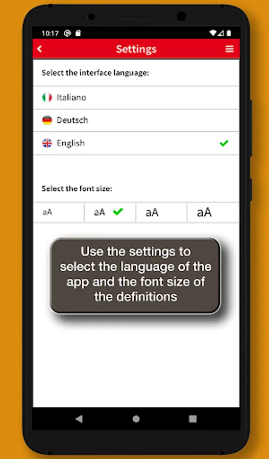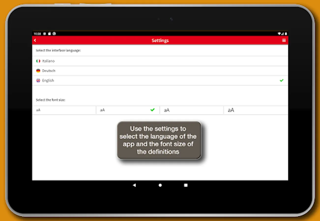 • Settings: allows you to choose the font size of the definitions and the language of the interface