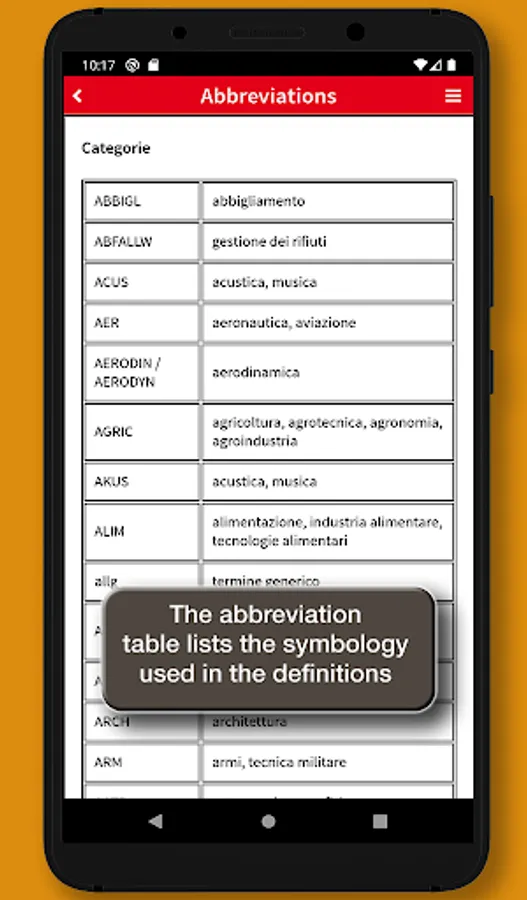 • Abbreviations: displays a table with an explanation of the abbreviations used within the definitions