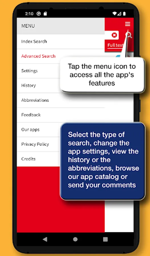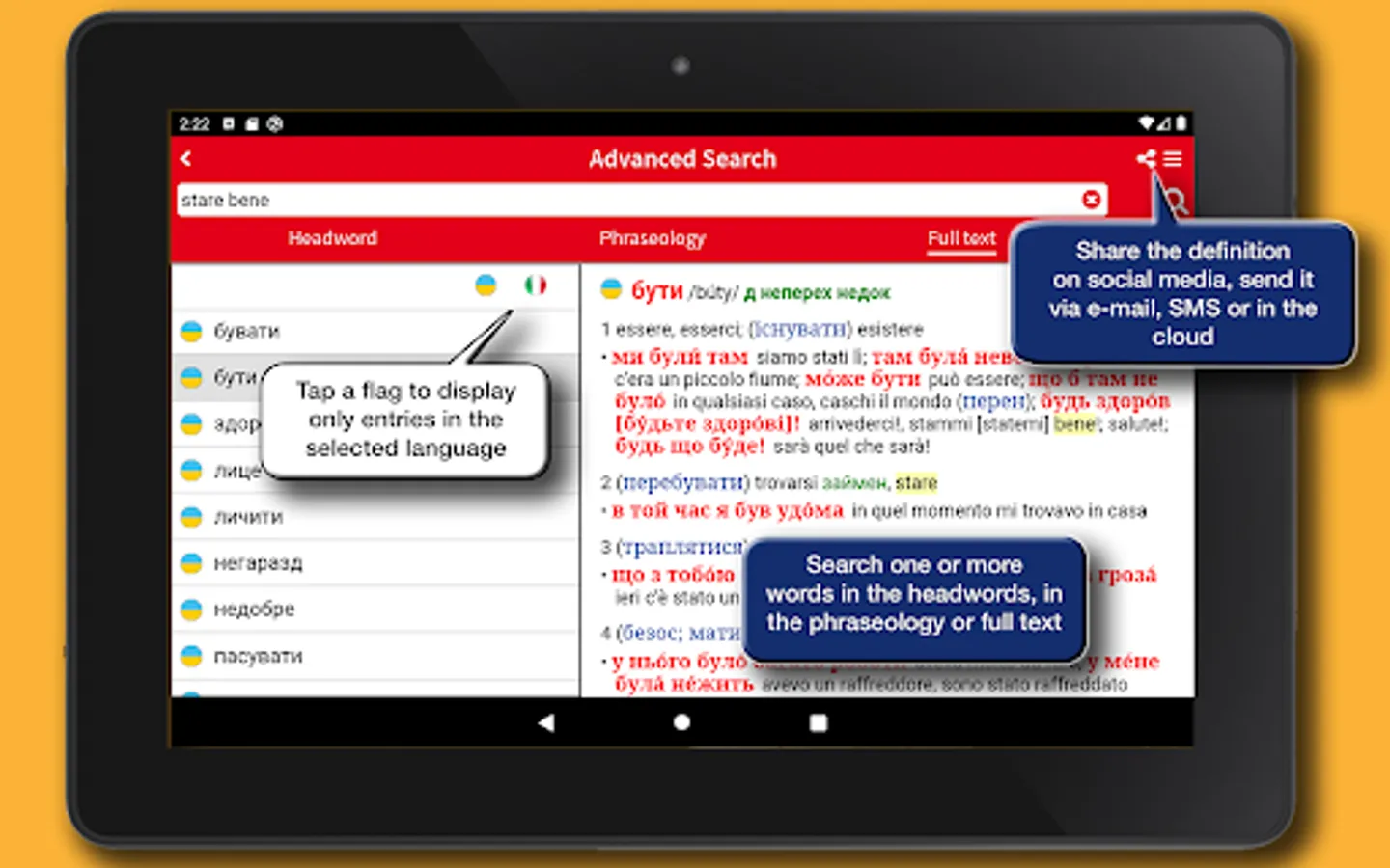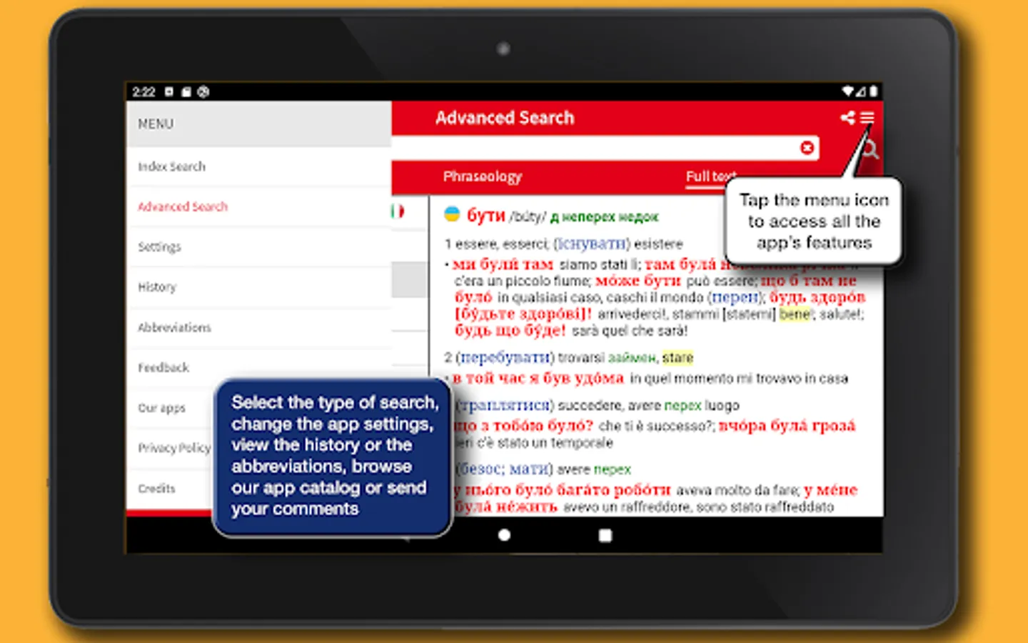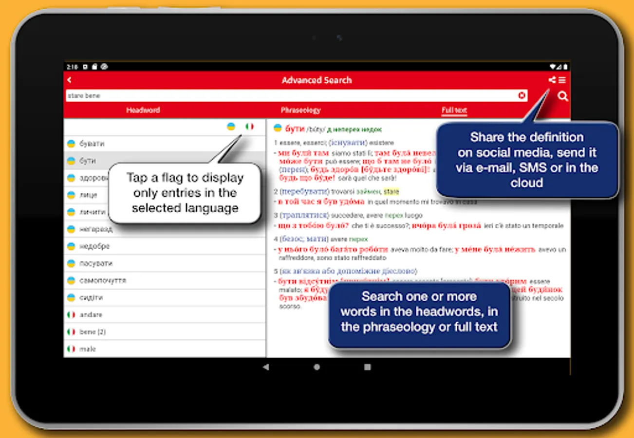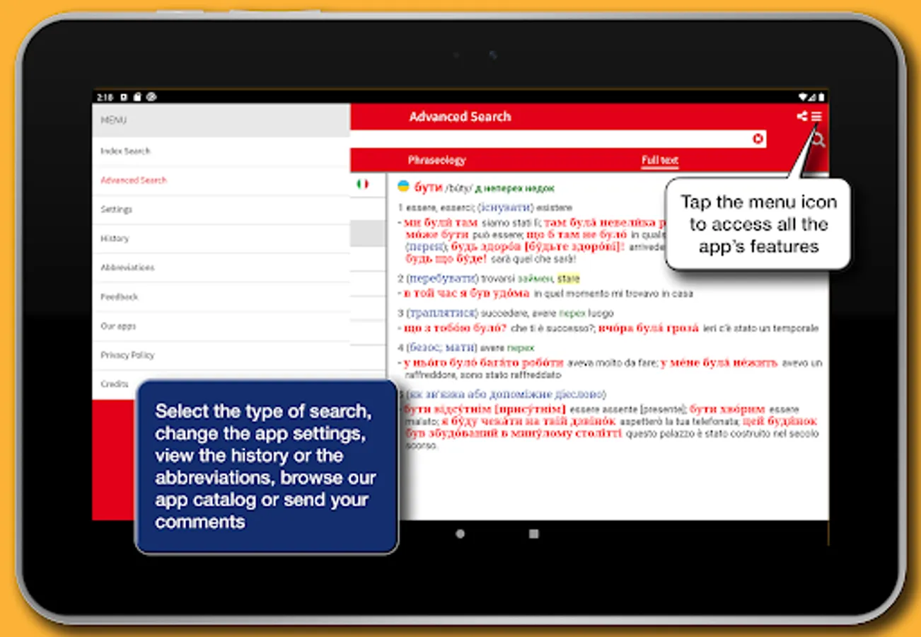 The app's interface has been designed to provide a simpler and more intuitive experience. Each definition can be shared using the features available in the device, such as social media, e-mail, SMS, cloud. A main menu that can be activated via an icon available at the top right of the screen enables all the features of the app: