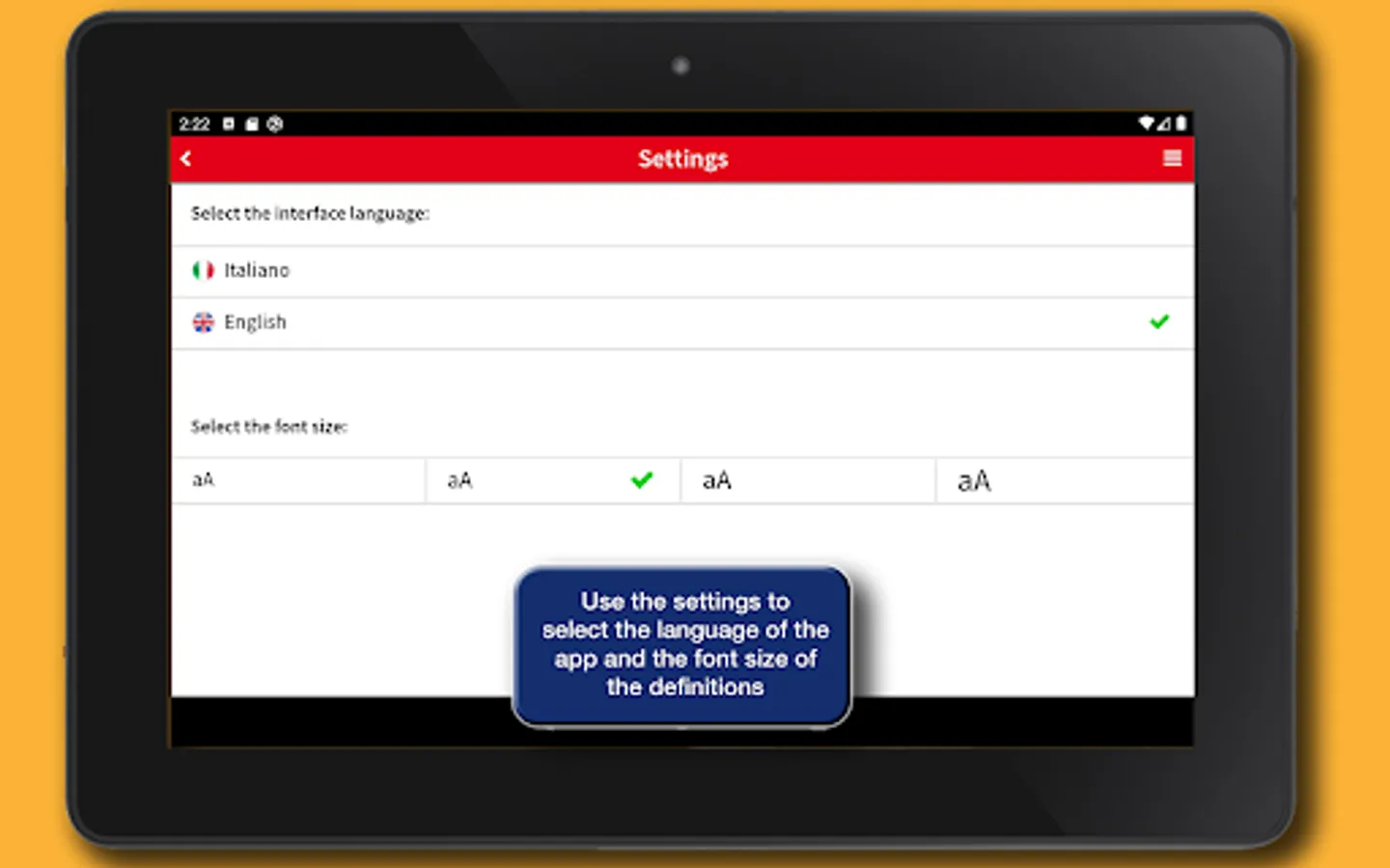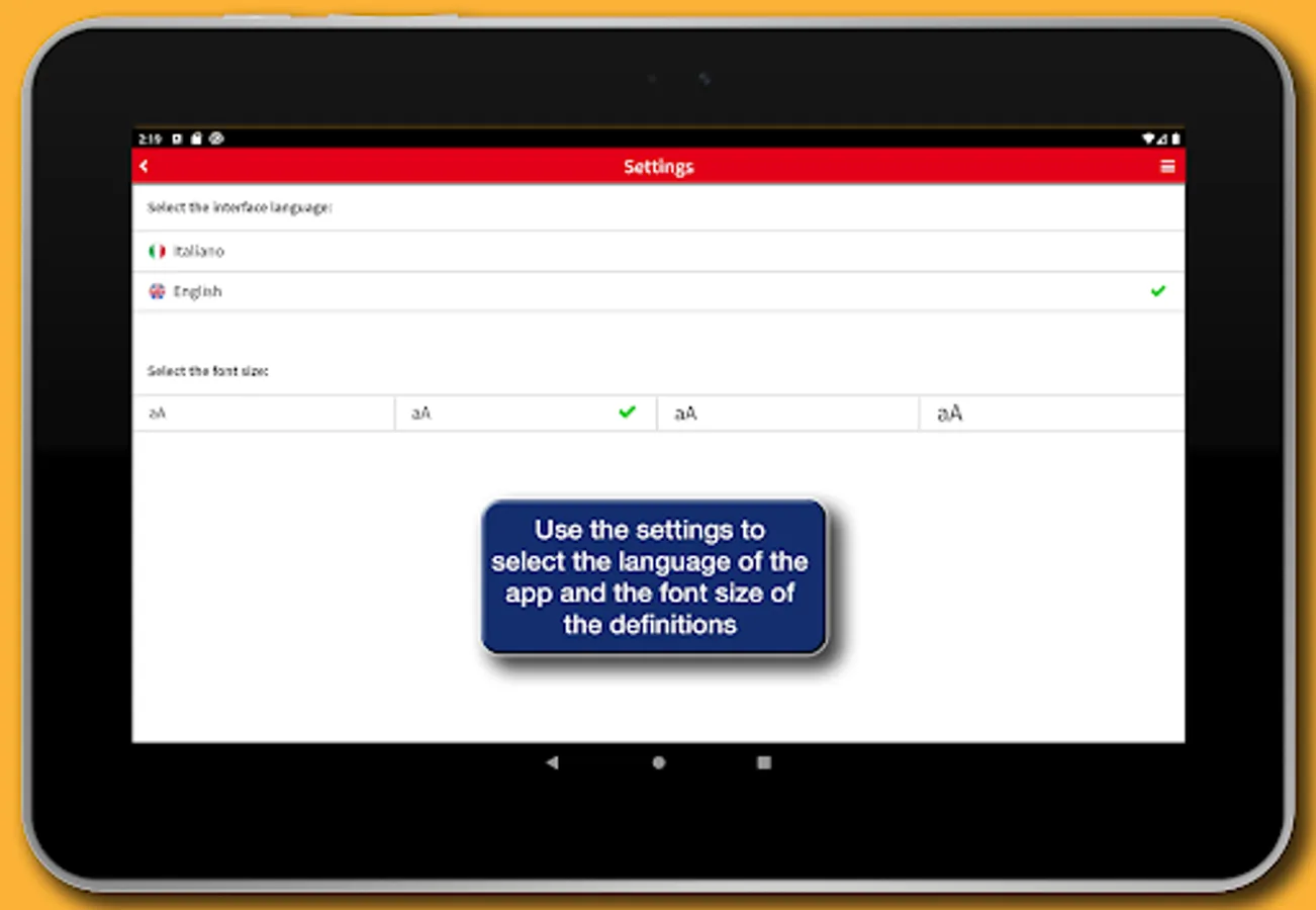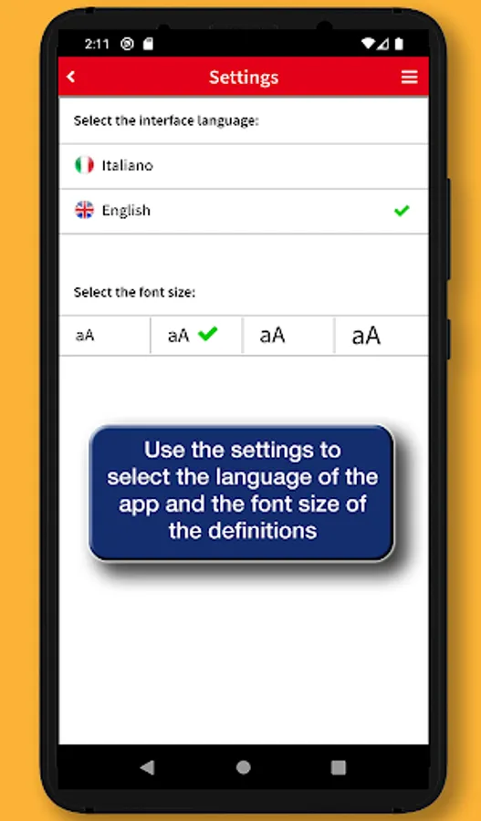 • Settings: allows you to choose the font size of the definitions and the language of the interface