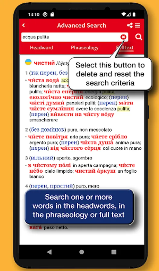 • Advanced search: lets you search for headwords, in the phraseology, and in full text
