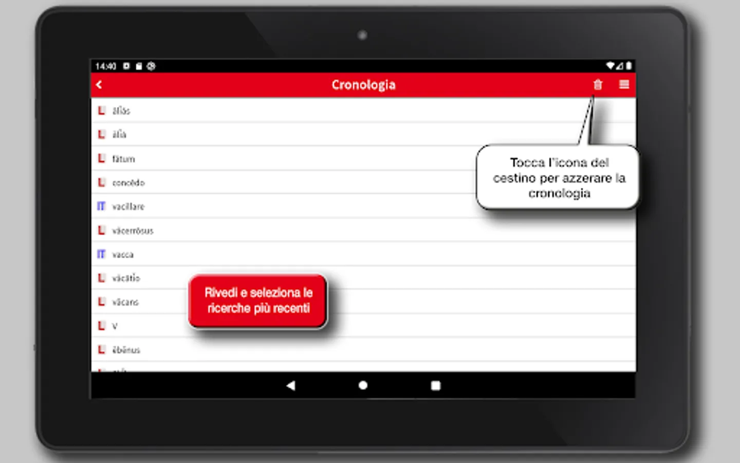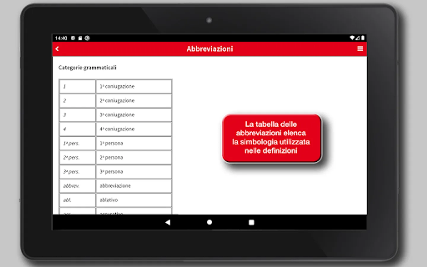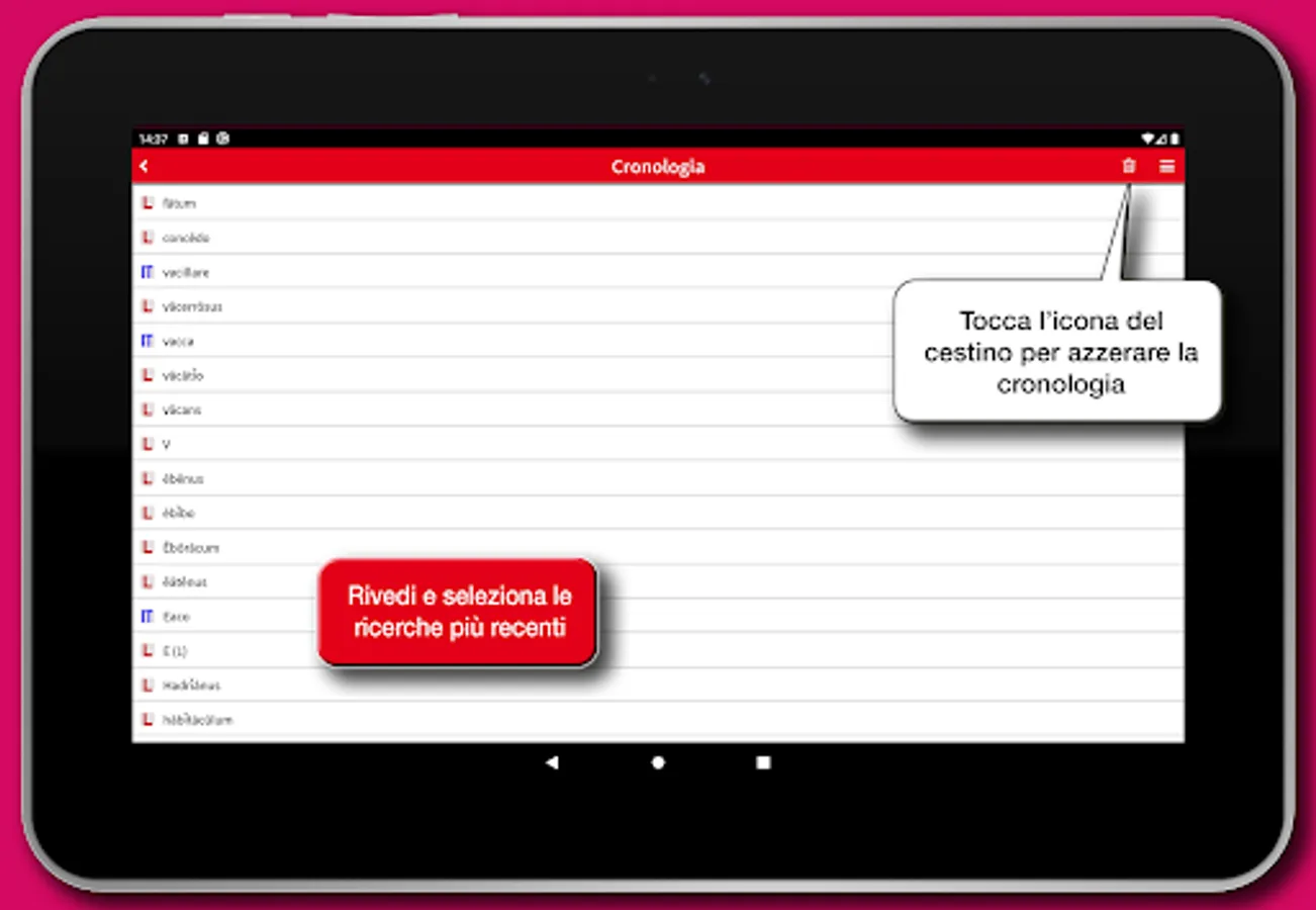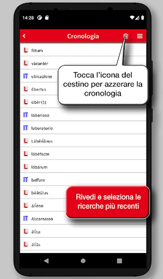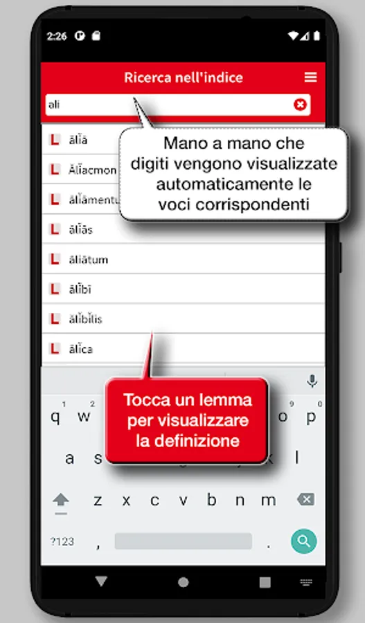 The project and its realization aim to provide a valid support in the translation through a complete tool, that is also easy in the consultation and clear. The resulting app is an innovative product, while retaining all the merits and reliability of traditional vocabularies, making it an invaluable reference tool for students and lovers of Latin, of good readability, easy to consult, rigorous and careful in the structures and usable in its entirety.
