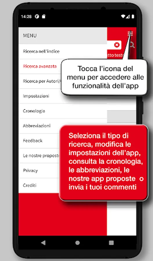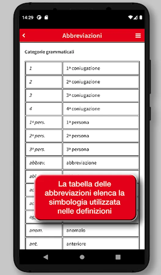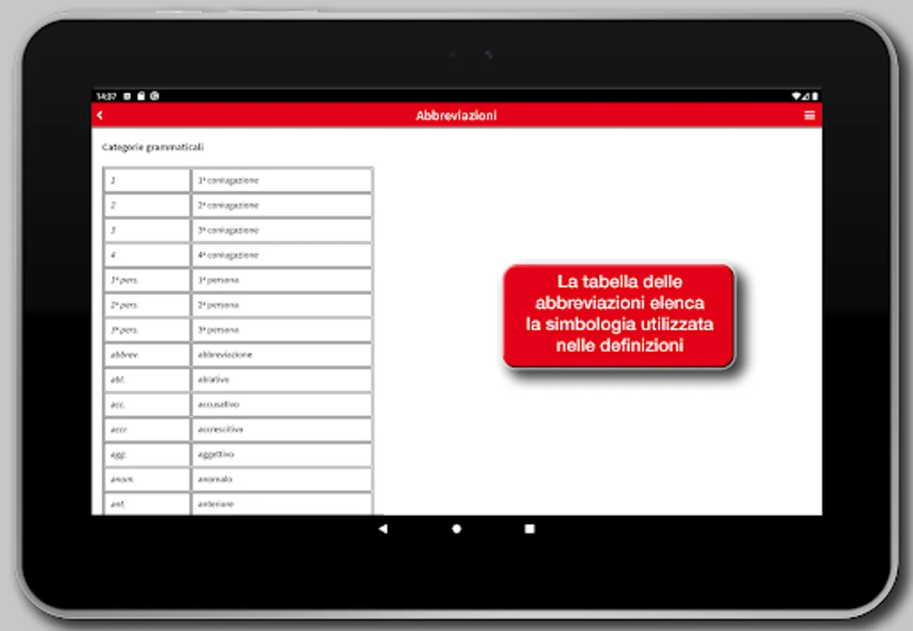 The app's interface has been redesigned to provide a simpler and more intuitive experience. Each definition can be shared using the features available in the device, such as social media, e-mail, SMS, cloud. A main menu that can be activated via an icon available at the top right of the screen enables all the features of the app: