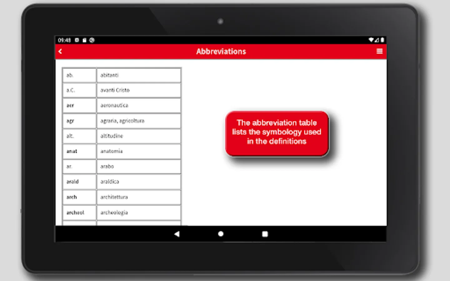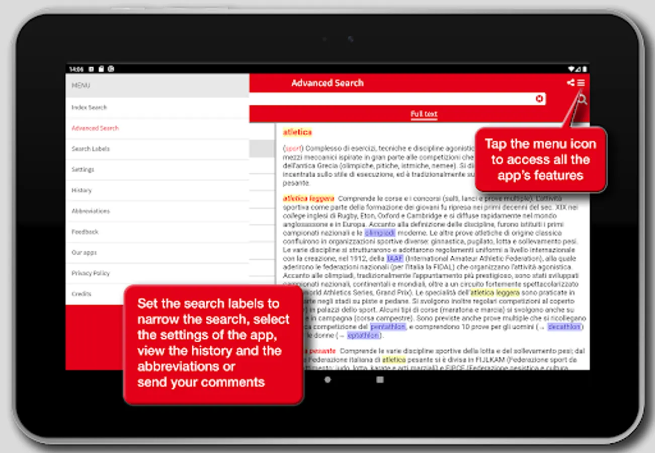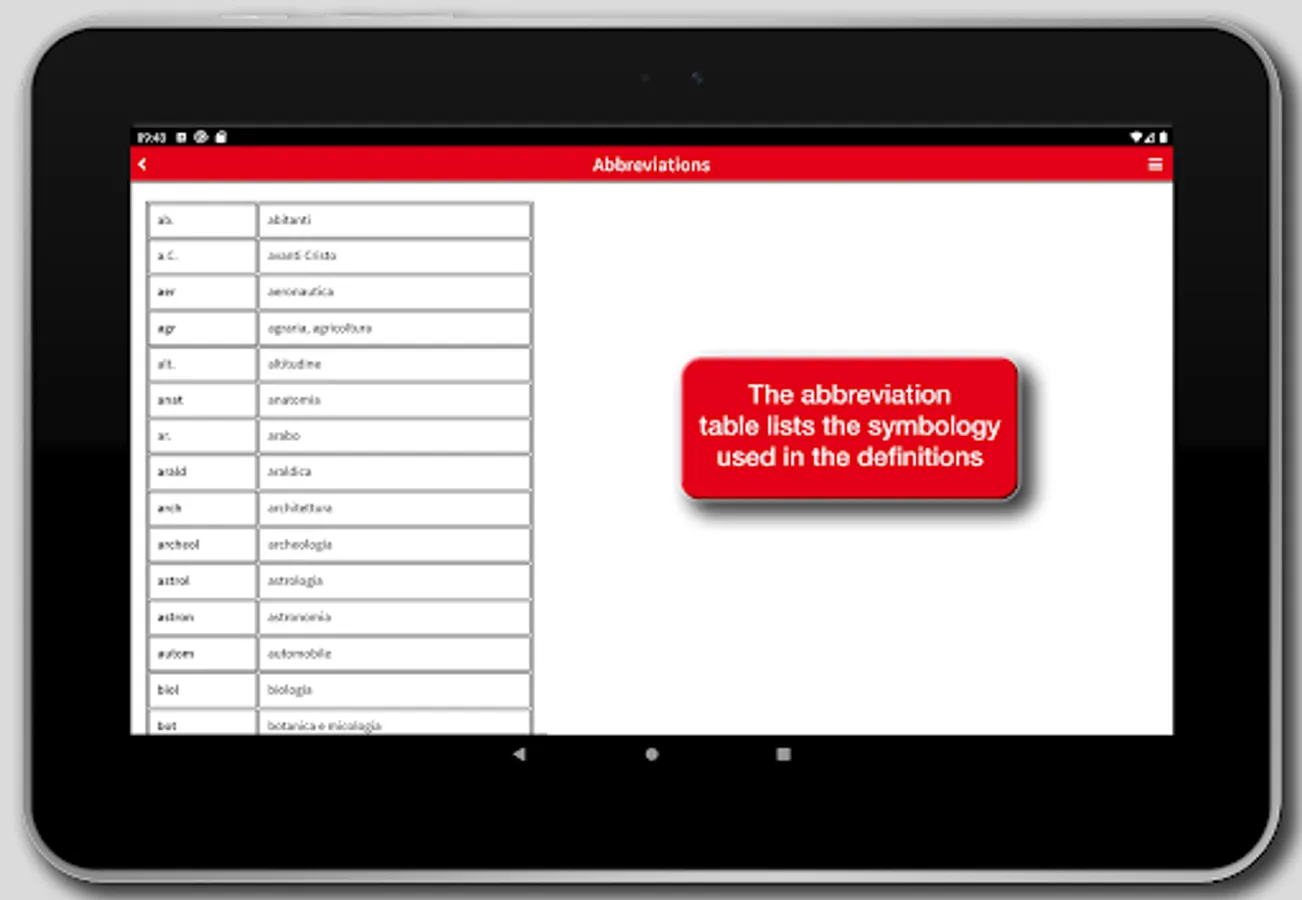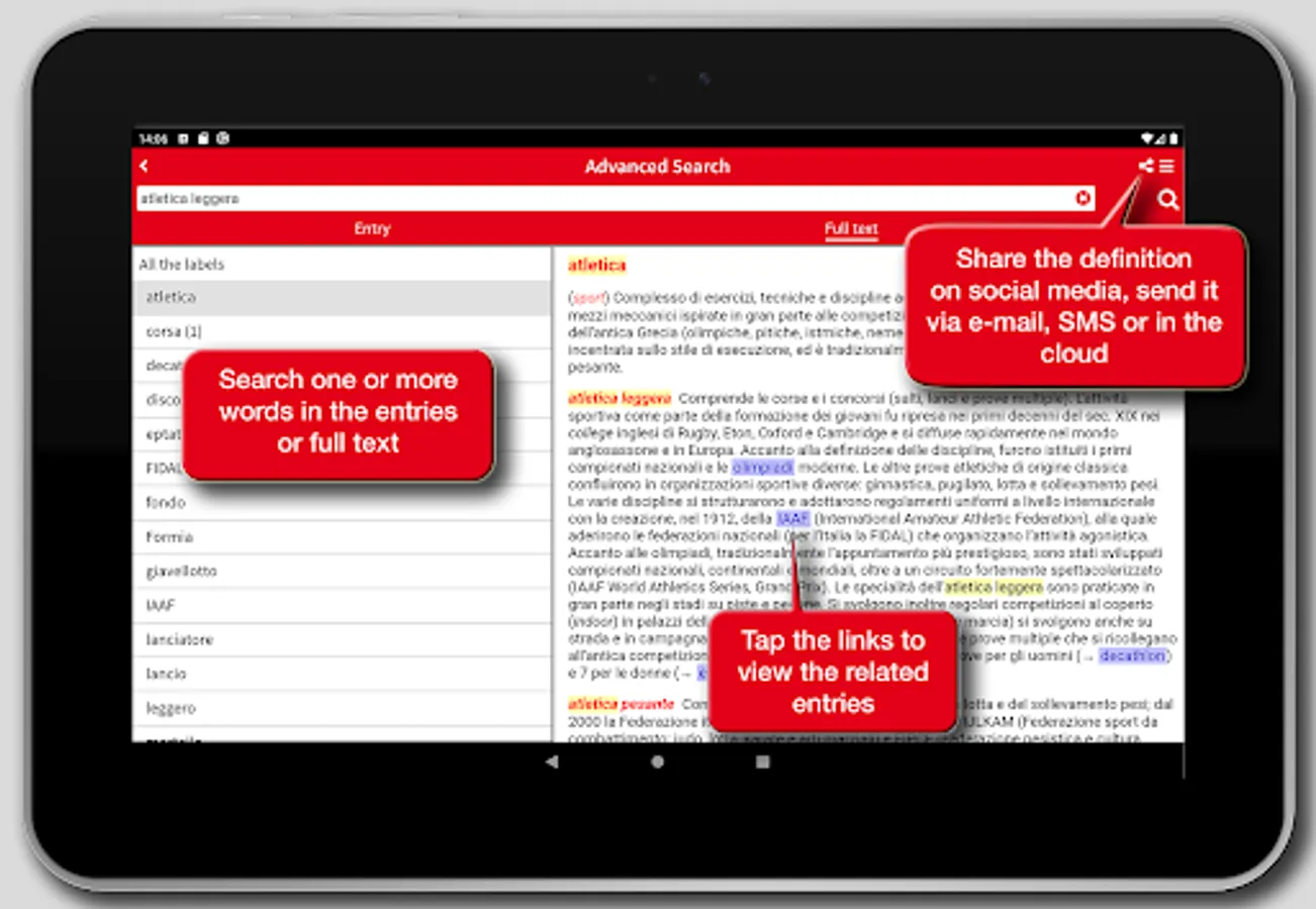 The app offers a user interface that provides a -simple and intuitive experience. Any definition can be shared using the features available on the device, such as social media, e-mail, SMS, cloud. A main menu that can be activated via an icon available at the top right of the screen provides access to all the app's features: