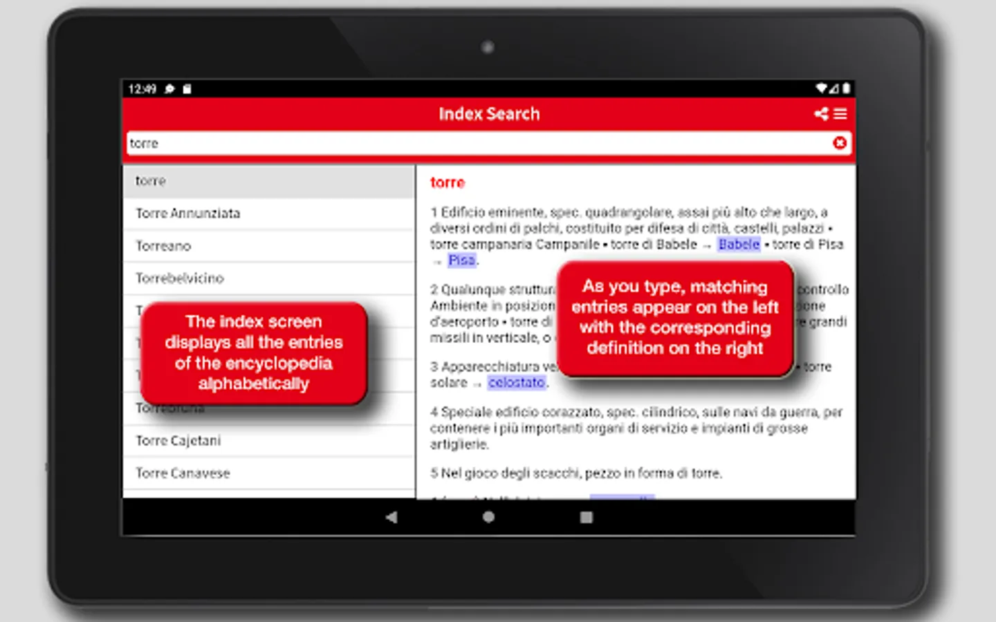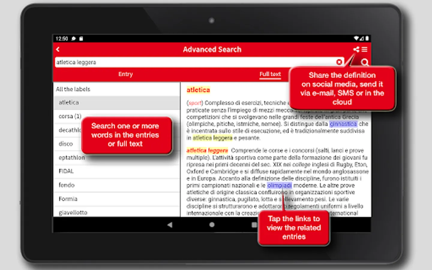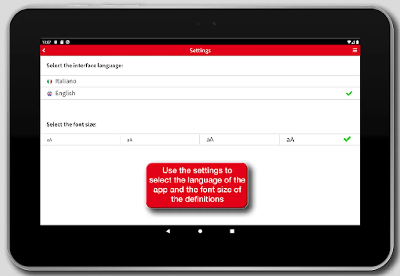 The app offers a user interface that provides a -simple and intuitive experience. Any definition can be shared using the features available on the device, such as social media, e-mail, SMS, cloud. A main menu that can be activated via an icon available at the top right of the screen provides access to all the app's features: