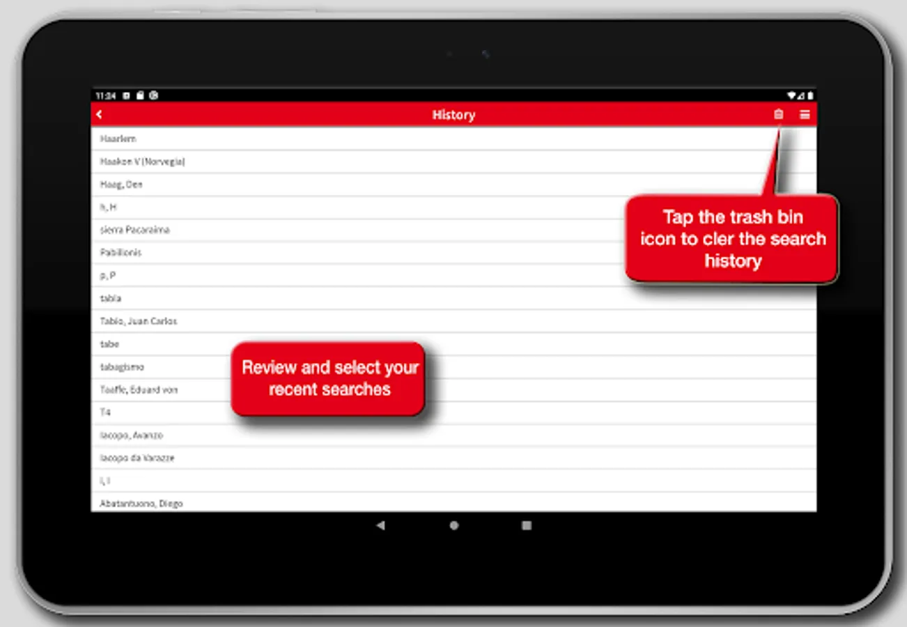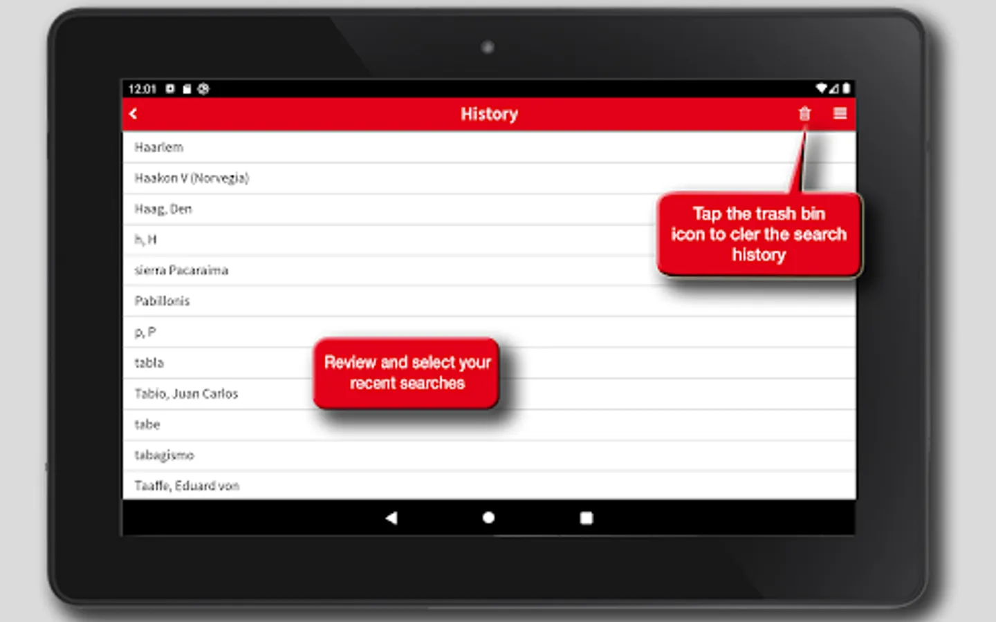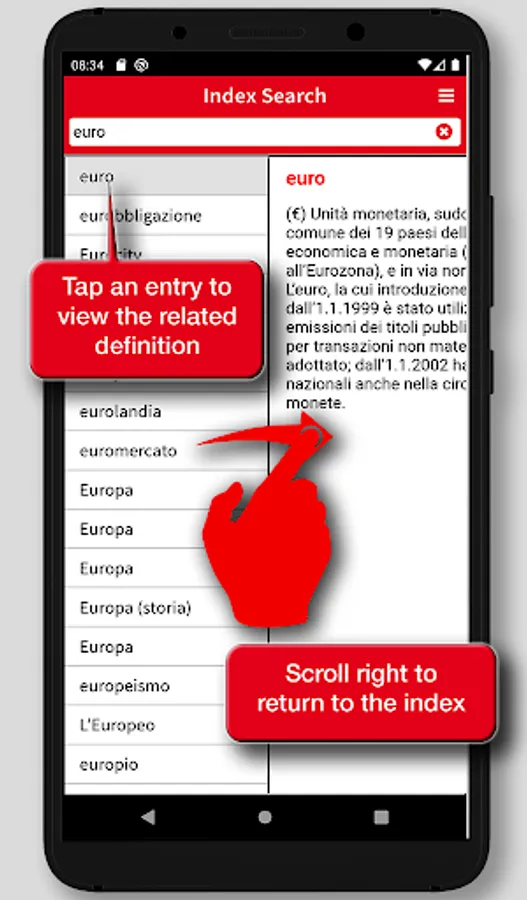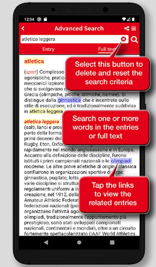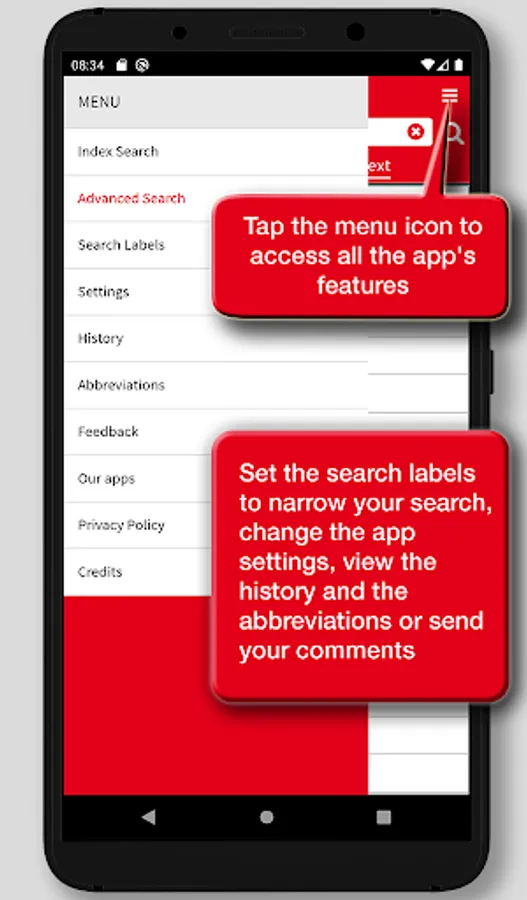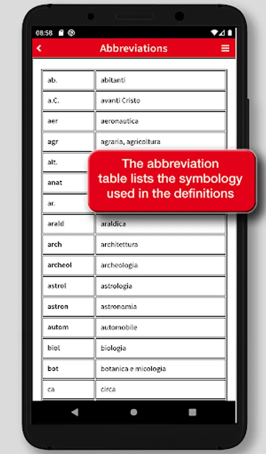 The app offers a user interface that provides a -simple and intuitive experience. Any definition can be shared using the features available on the device, such as social media, e-mail, SMS, cloud. A main menu that can be activated via an icon available at the top right of the screen provides access to all the app's features: