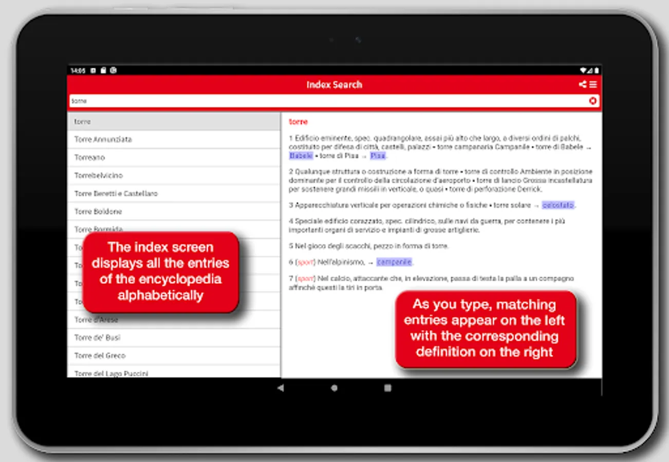 The "la Zanichelli" app is an encyclopedia you can consult anywhere, designed to resolve doubts, clarify concepts, provide information, and suggest ideas in all branches of knowledge. There are proper names, specialized phrases, and commonly used terms that require encyclopedic investigation, treated in a comprehensive and concise manner. The content is updated regularly by the editorial staff, which keeps abreast of developments in the world's political, economic and cultural scenarios. The app's automatic update feature thus makes it possible to have an up-to-date version of the encyclopedia available at all times.