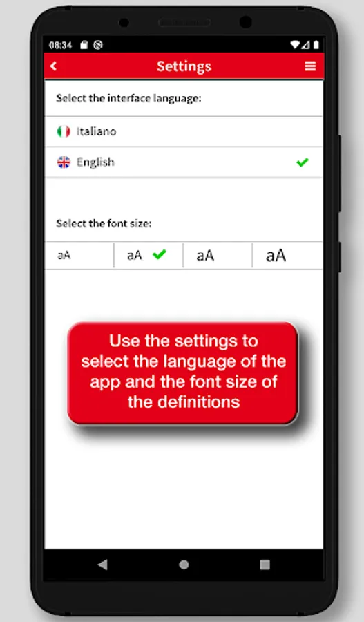 • Settings: allows you to choose the font size of the definitions and the language of the interface